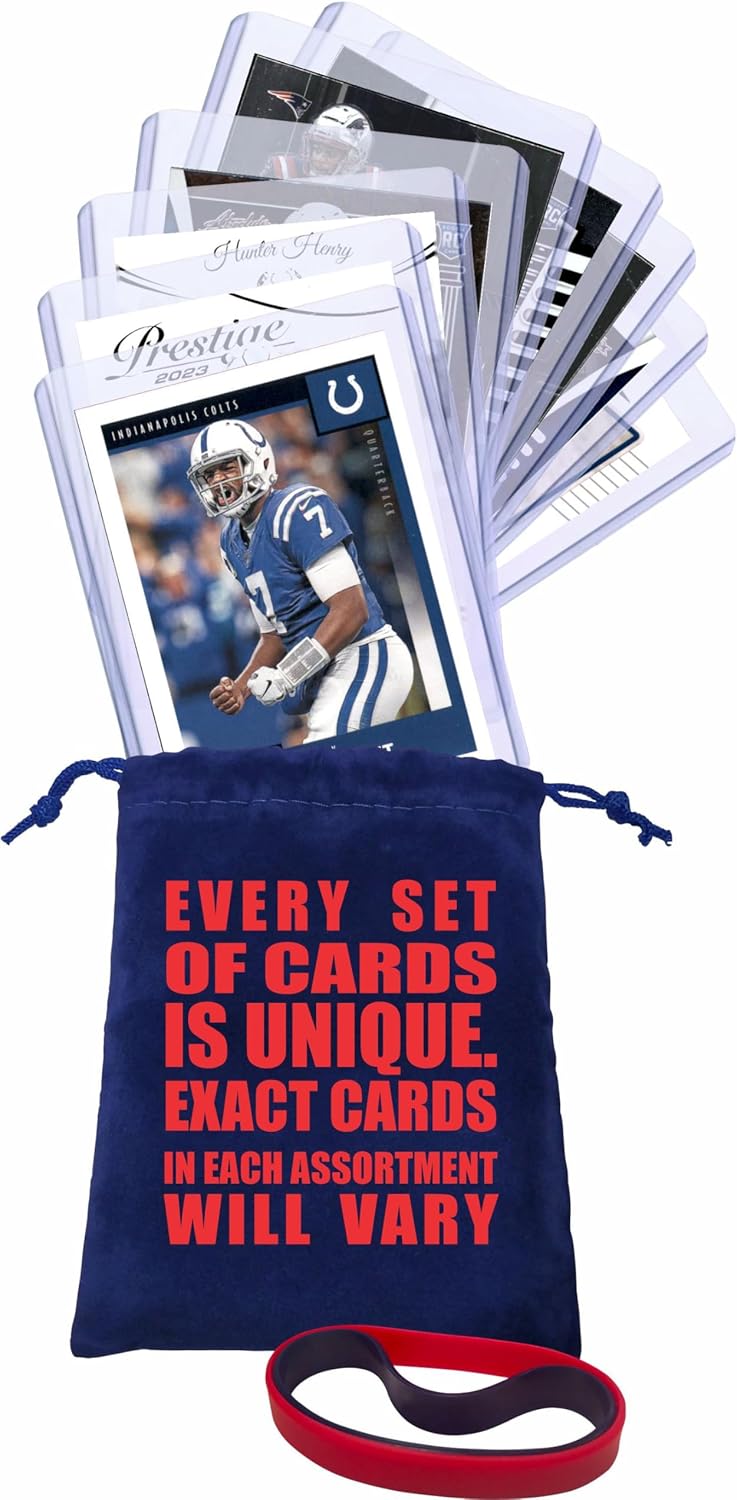 The Patriots are red hot! This lot of ten 2006-2025 New England Patriots football cards makes a great gift and collectors item for any Pats fan. Guaranteed to include one card each of Drake Maye, Stefon Diggs, Hunter Henry, Rhamondre Stevenson, Kendrick Bourne, Kyle Williams, Demario Douglas, Drew Bledsoe, Tom Brady, and Julian Edelman. Exact card of each player varies and may include cards in past team uniforms. All cards are in near mint to mint condition and are shipped with each card in its own individual soft sleeve and top loader or semi-rigid sleeve. Comes with bonus gift bag and two wristbands in team colors, making it the perfect gift for the youth fan. WRISTBANDS AND GIFT BAG INCLUDED ARE UNBRANDED GIFT ITEMS AND DO NOT CONTAIN ANY TEAM OR LEAGUE RELATED BRANDING, LOGOS, OR TEXT.