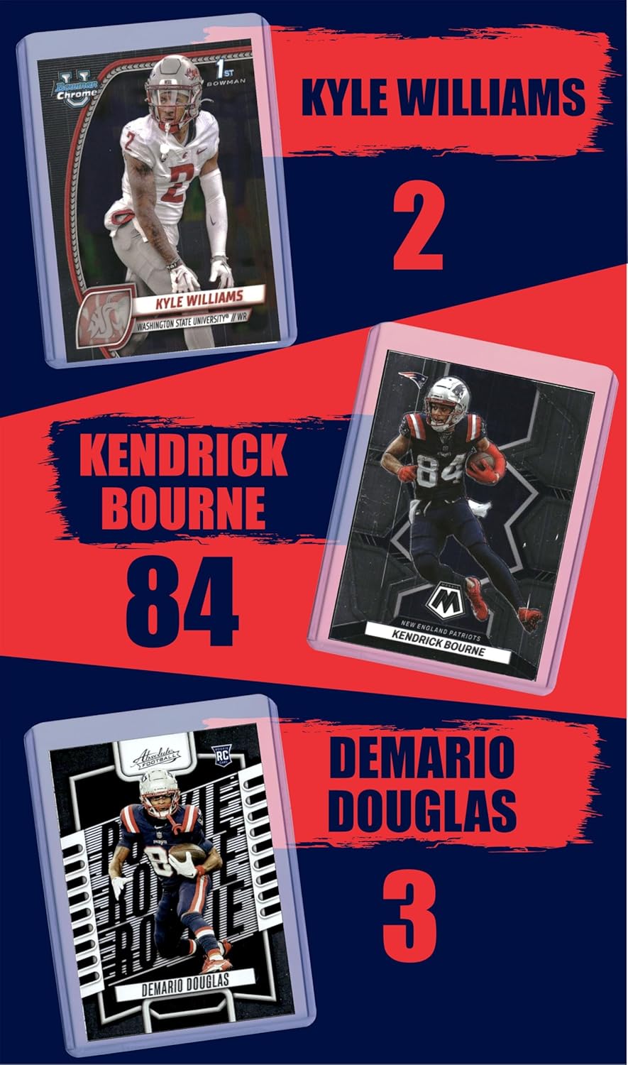 GUARANTEED – to include one card each of Drake Maye, Stefon Diggs, Hunter Henry, Rhamondre Stevenson, Kendrick Bourne, Kyle Williams, Demario Douglas, Drew Bledsoe, Tom Brady, and Julian Edelman. Exact card of each player varies and may include cards in a past team jersey.