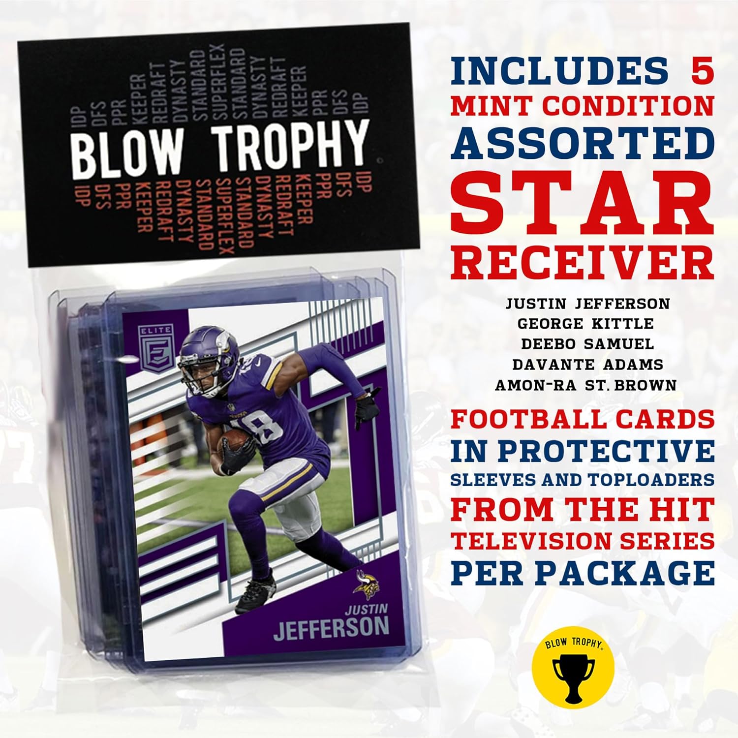 This is a set of five (5) premium Receiver Superstar football trading cards, protected by a sleeve and toploader. The set includes an assortment of 5 authentic and officially licensed receiver football cards featuring the players in the hit streaming television documentary episode series Receiver Justin Jefferson, George Kittle, Deebo Samuel, Davante Adams, and Amon-Ra St. Brown, and a code for a Blow Trophy Exclusive Dynasty Fantasy Football eBook.