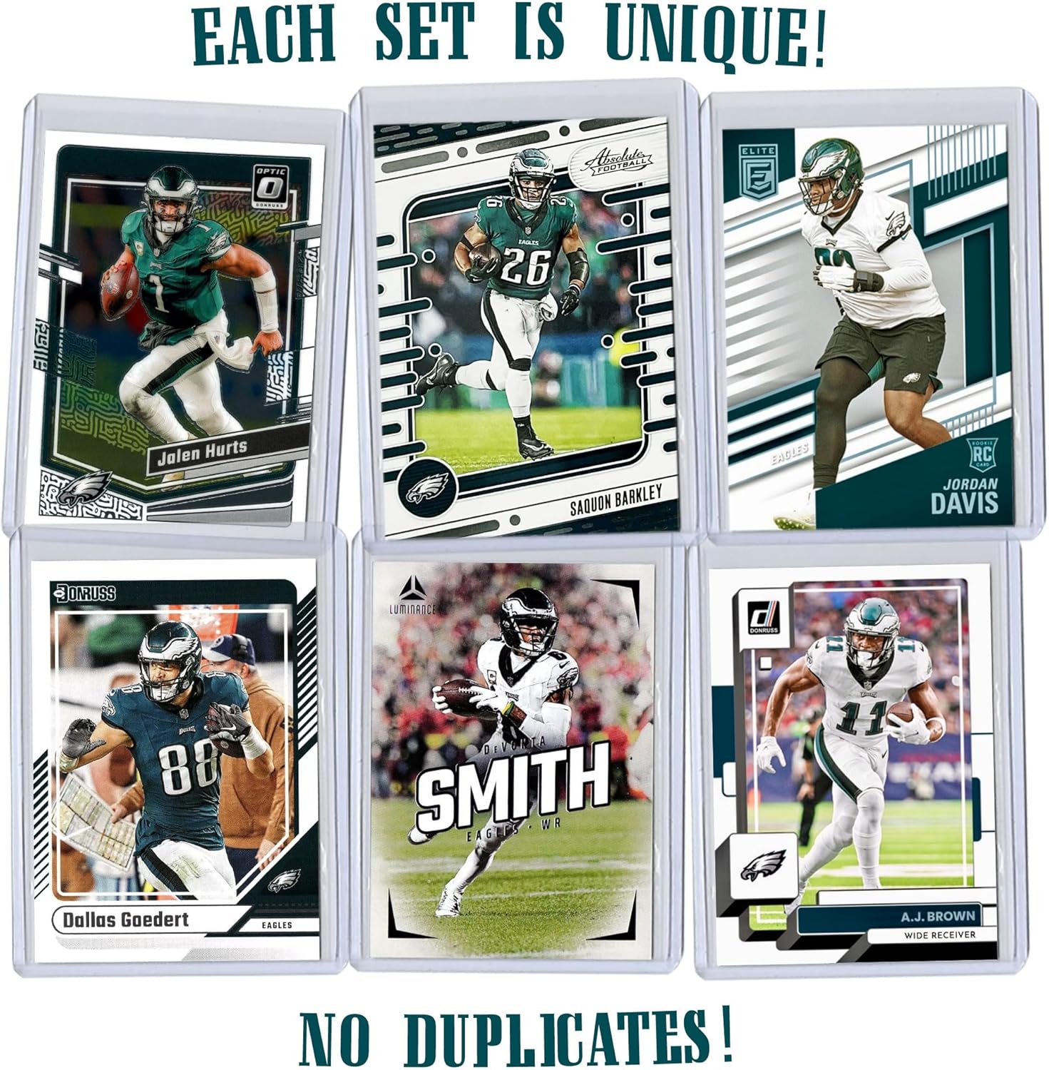 Includes an exclusive assortment of football players on the Philadelphia Eagles roster for Super Bowl LIX. Featuring Philadelphia Eagles star running back Saquan Barkley, tight end Dallas Goedert, wide receiver AJ Brown, quarterback Jalen Hurts, wide receiver DeVonta Smith and one other Philadelphia Eagles star football players in a fantastic six-card set! Each assortment of cards varies but will always contain six Eagles — a great Philadelphia Eagles Gift.
