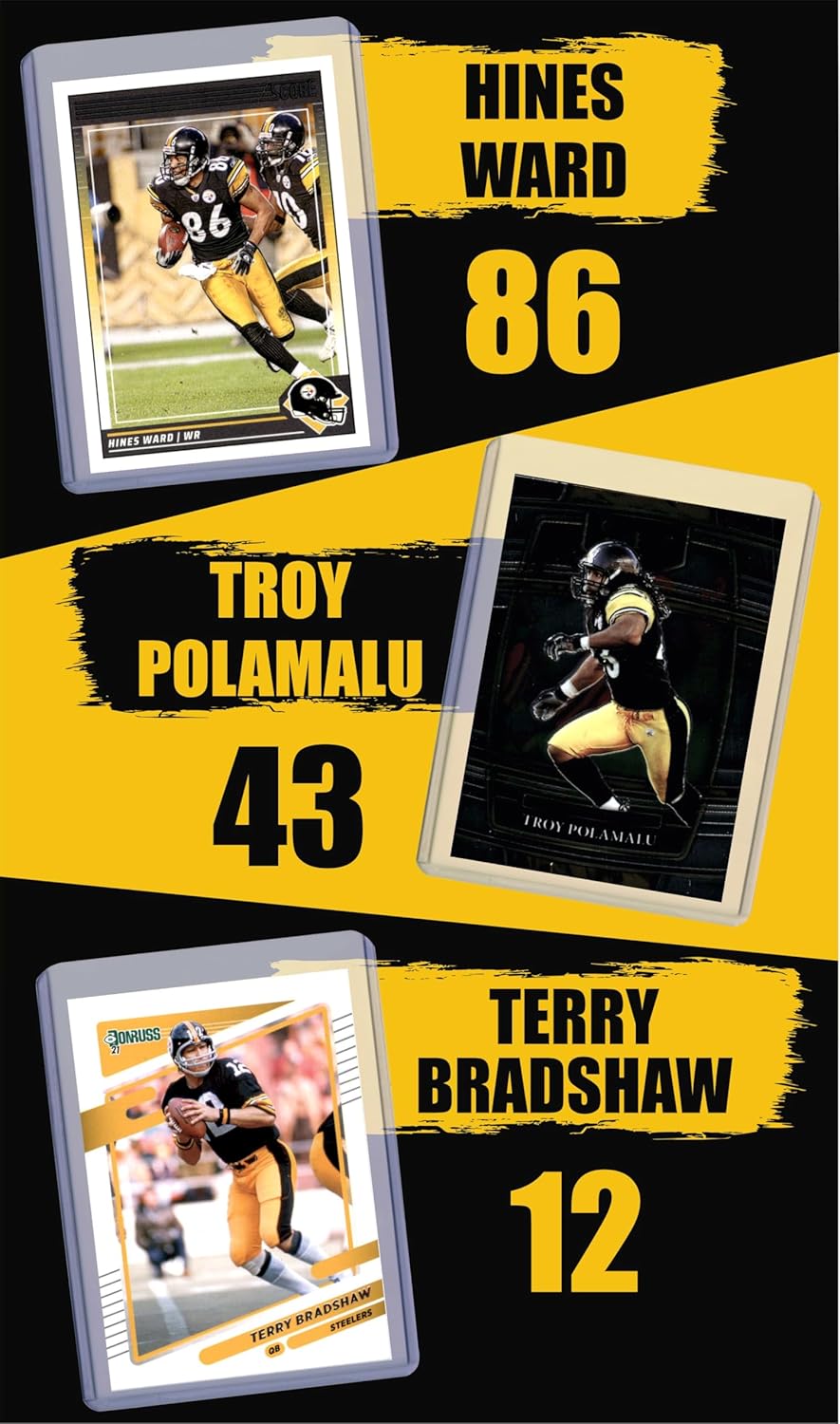 The Pittsburgh Steelers are red hot! This lot of nine 2006-2024 Pittsburgh Steelers football cards makes a great gift and collectors item for any Steelers fan. Guaranteed to include one card each of Ben Roethlisberger, Jerome Bettis, Franco Harris, Hines Ward, Troy Polamalu, Terry Bradshaw, James Harrison, Antonio Brown, and Jack Ham. Exact card of each player varies and may include cards in past team uniforms. All cards are in near mint to mint condition and are shipped with each card in its own individual soft sleeve and top loader or semi-rigid sleeve. Comes with bonus gift bag and two wristbands in team colors, making it the perfect gift for the youth fan. WRISTBANDS AND GIFT BAG INCLUDED ARE UNBRANDED GIFT ITEMS AND DO NOT CONTAIN ANY TEAM OR LEAGUE RELATED BRANDING, LOGOS, OR TEXT.