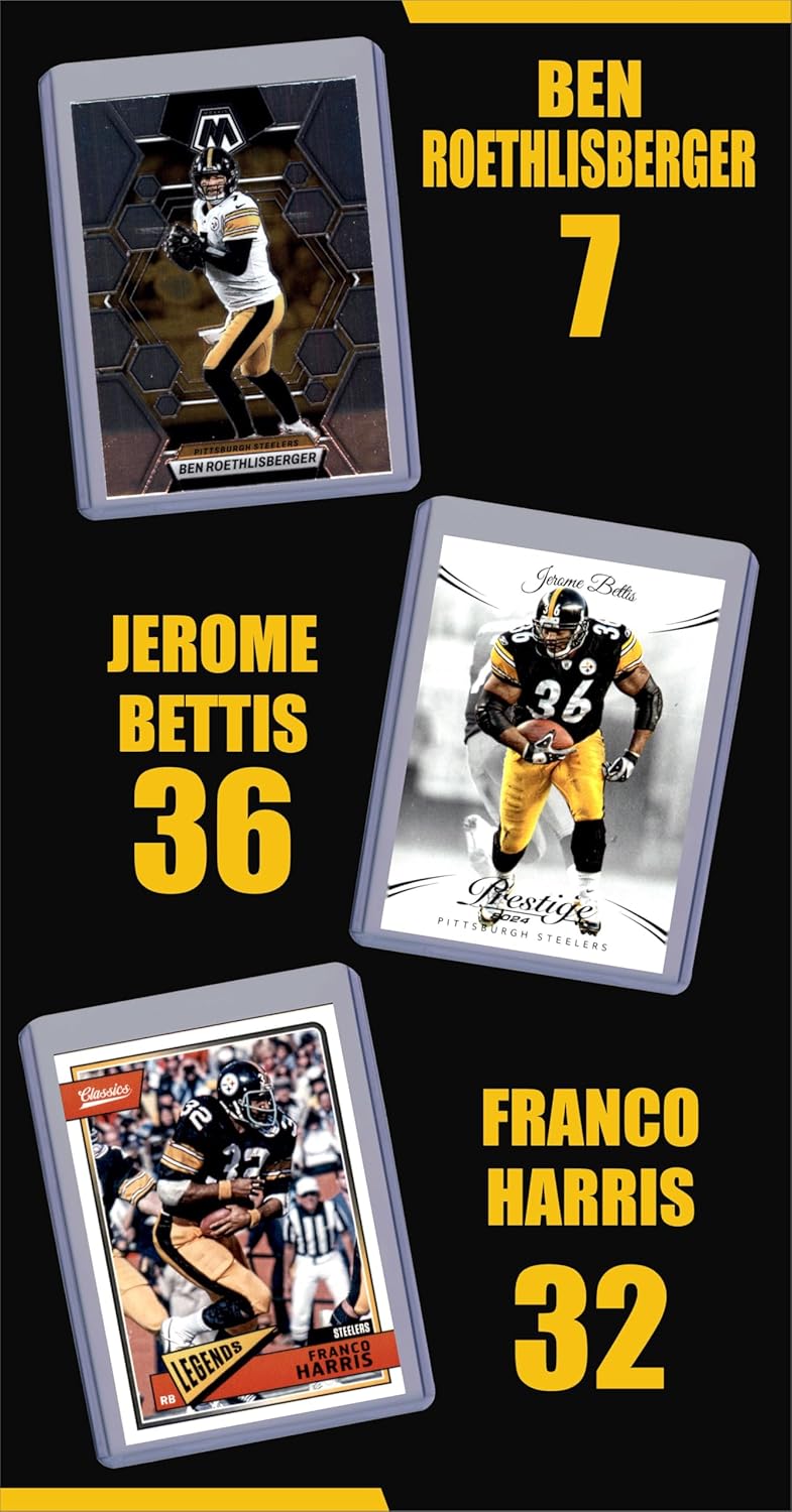 The Pittsburgh Steelers are red hot! This lot of nine 2006-2024 Pittsburgh Steelers football cards makes a great gift and collectors item for any Steelers fan. Guaranteed to include one card each of Ben Roethlisberger, Jerome Bettis, Franco Harris, Hines Ward, Troy Polamalu, Terry Bradshaw, James Harrison, Antonio Brown, and Jack Ham. Exact card of each player varies and may include cards in past team uniforms. All cards are in near mint to mint condition and are shipped with each card in its own individual soft sleeve and top loader or semi-rigid sleeve. Comes with bonus gift bag and two wristbands in team colors, making it the perfect gift for the youth fan. WRISTBANDS AND GIFT BAG INCLUDED ARE UNBRANDED GIFT ITEMS AND DO NOT CONTAIN ANY TEAM OR LEAGUE RELATED BRANDING, LOGOS, OR TEXT.