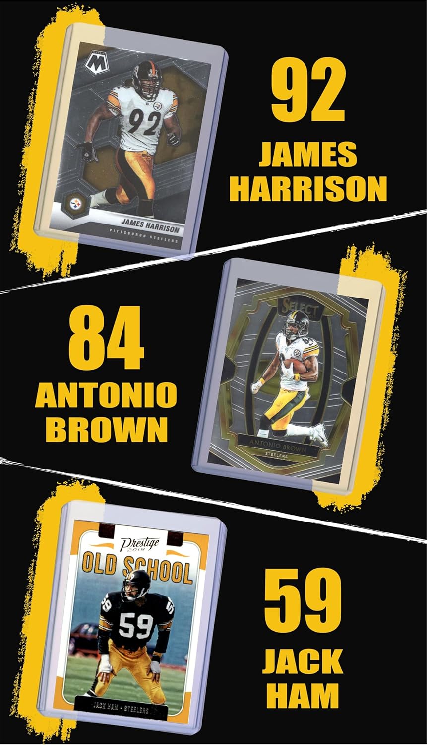 GUARANTEED – to include one card each of Ben Roethlisberger, Jerome Bettis, Franco Harris, Hines Ward, Troy Polamalu, Terry Bradshaw, James Harrison, Antonio Brown, and Jack Ham. Exact card of each player varies and may include cards in a past team jersey.