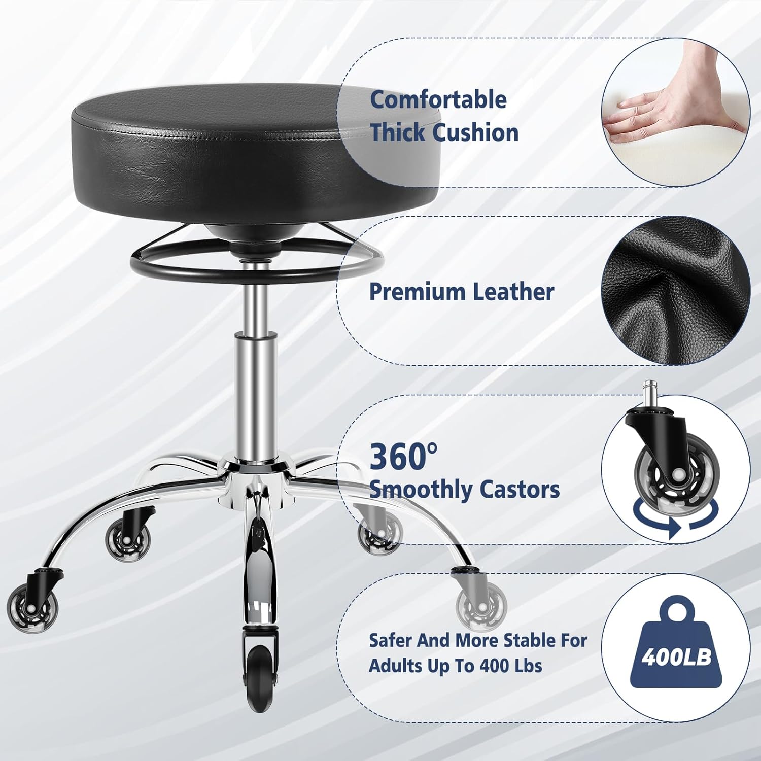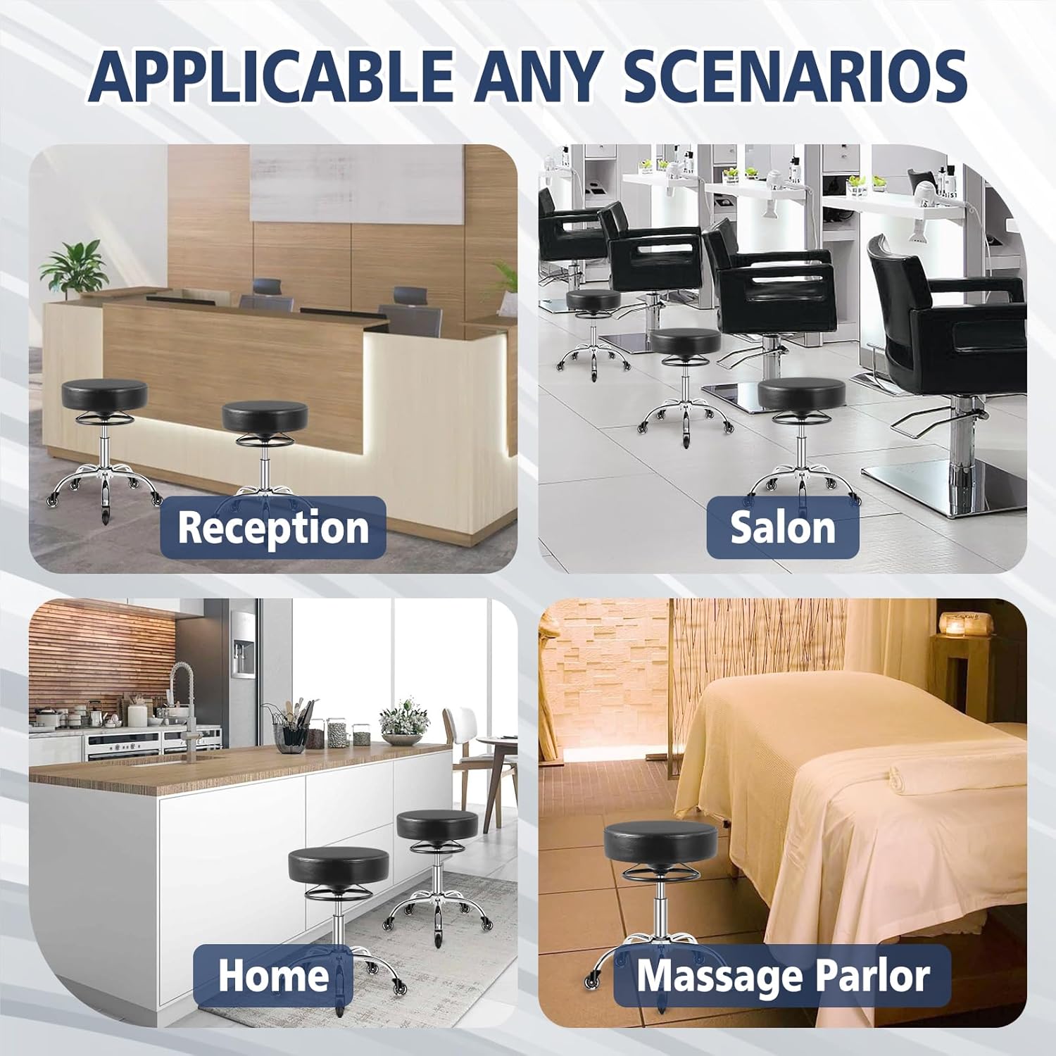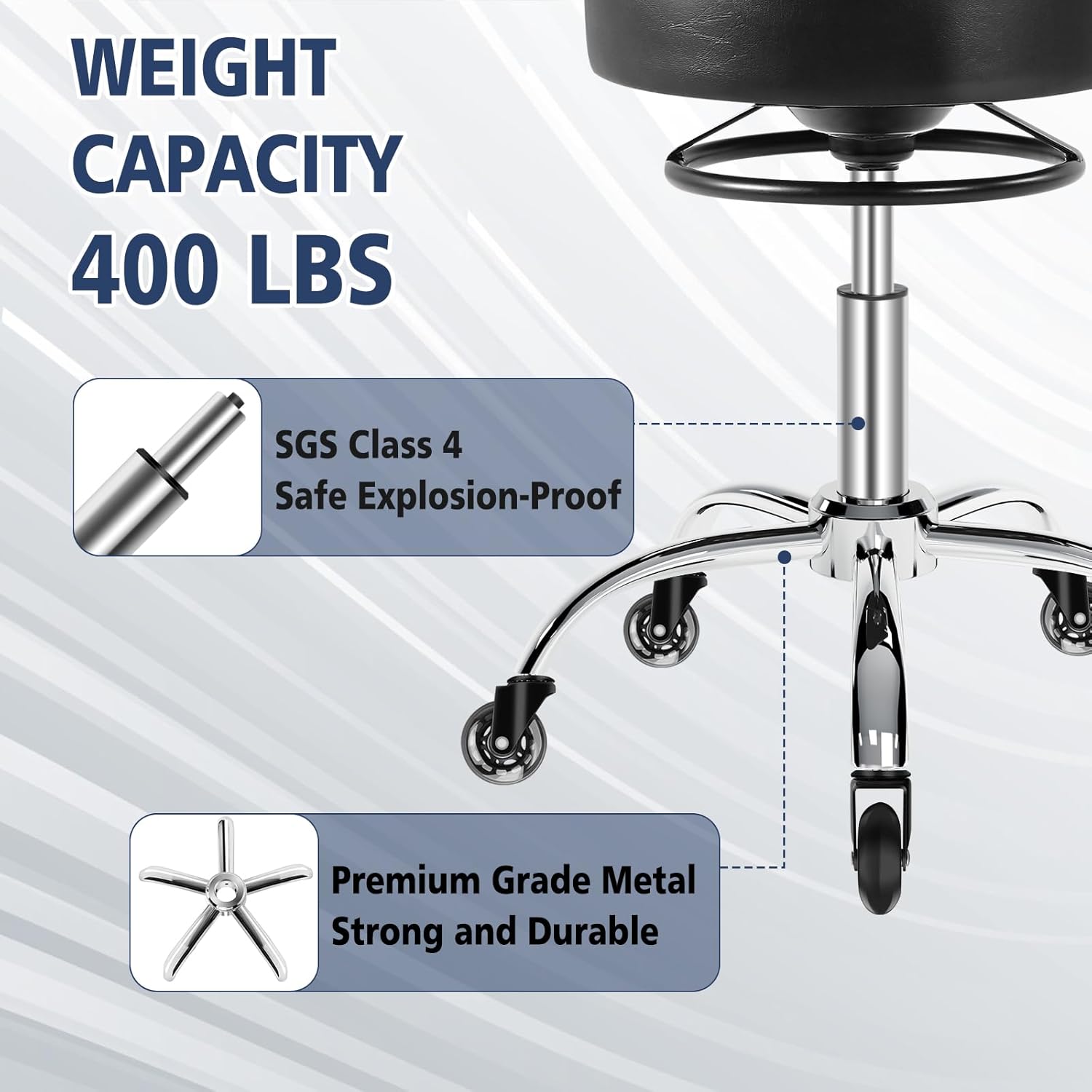 【400LBS WEIGHT CAPACITY】 This rolling stool with wheels is constructed of strong chrome finish base and heavy duty casters,massage stools,stool chair can hold up to 400lb, ideal solution for salon, studio, tatoo,message,medical professionals as well as at-home daily use.
