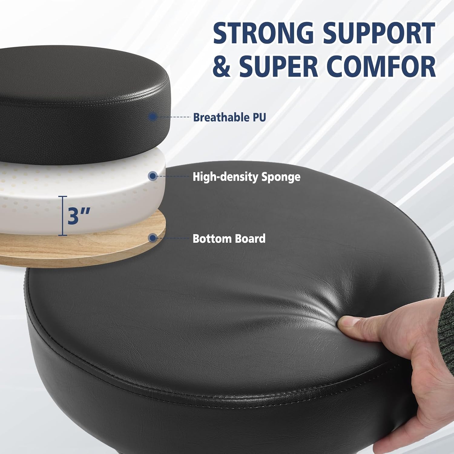 【COMFORTABLE THICK SEAT PADDING】Stool chair with 13.5” diameter x 3” thick cushioned seat, brand new high density sponge bonded leather upholstery,double stitching to made it more durable and comfortable.Also,it can be swivel 360-degree, adjustable height from 18.7 to 23.8 inches.