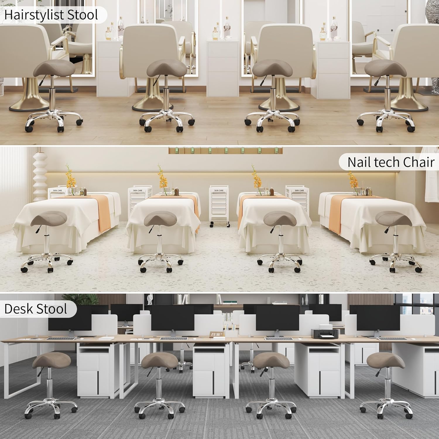 【Widely Used】Suitable for hair salons, beauty parlors, clinics, and studios where prolonged standing is required. This rolling stool is the ideal choice for professionals such as stylist, artist, dentist, and engineers.