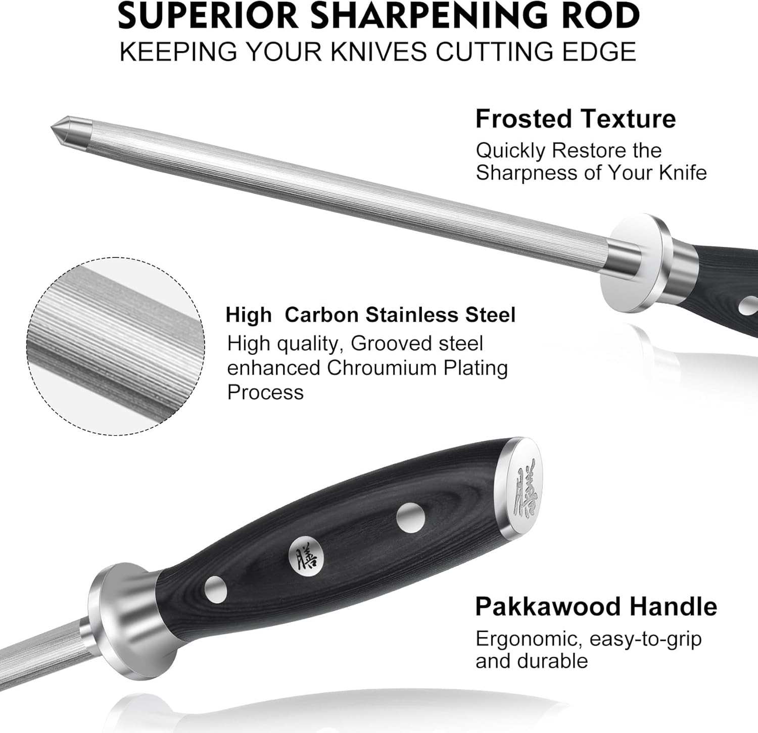 【Fiberglass G10 Handle, Comfortable Grip 】 Adopts frosted glass fiber G10 handle which is much more comfortable and solider than the wood handle, it becomes an ergonomically designed top-balanced professional knife to provide high-performance cutting for meat, vegetable, and fish.