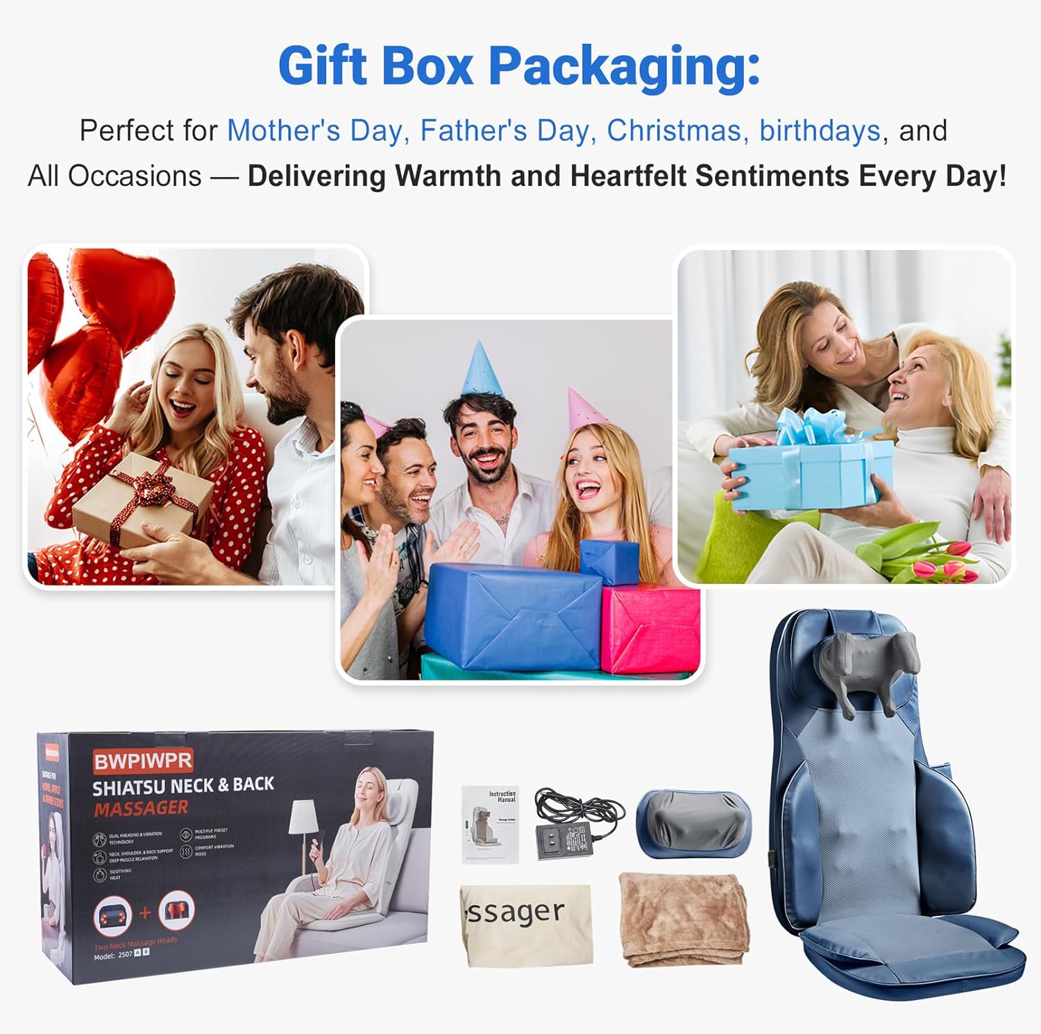 Everything you need comes in the box—ready to use ASAP: You get 2 neck massagers (3D for deep comfort, 4D for broad support), a BWPIWPR full-back massager, a super-soft blanket (color randomly shipped), storage bag, remote, and adapter. No hidden extras needed
