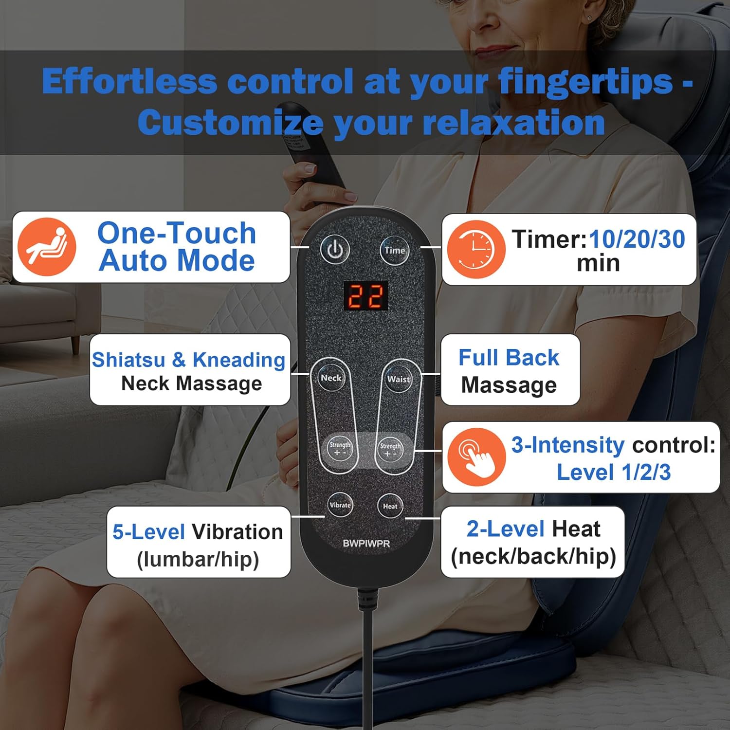 Your personal massage menu, 3 styles + 5 speeds: Mix and match kneading, shiatsu, and rolling for your neck/back, with 5 vibration speeds for your waist/hips. Set the 10-30 min timer and relax – all controls are right on the pane