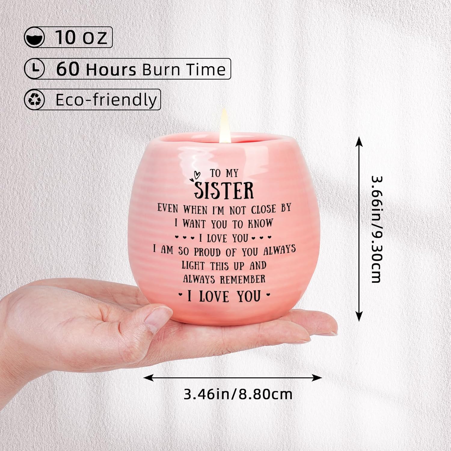 【Unique Gift for Sister】This candle with the warm words “Even when I’m not close by, I want you to know I love you and I am so proud of you always…” makes a great gift for your best sister. Every her birthday, graduation, back to school, wedding, engagement, mothers day, valentine’s day, Christmas, and Thanksgiving, this gorgeous gift can be given to a sister to show how much you love her.
