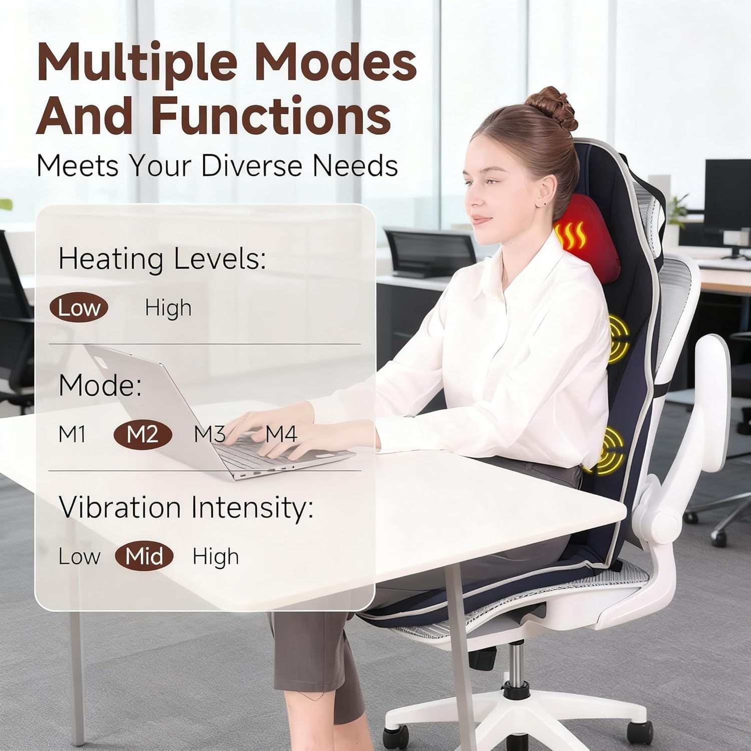 Back Massager with Heat: This back massager for pain relief deep tissue is equipped with 2 levels of heating and 2 heating areas(one on the pillow and one on the waist) to heat and soothe your lower back.The heated back massager functions are independently turned on, you can choose to turn on the heating function alone or turn on the massage function alone, it is better to turn on both functions if needed