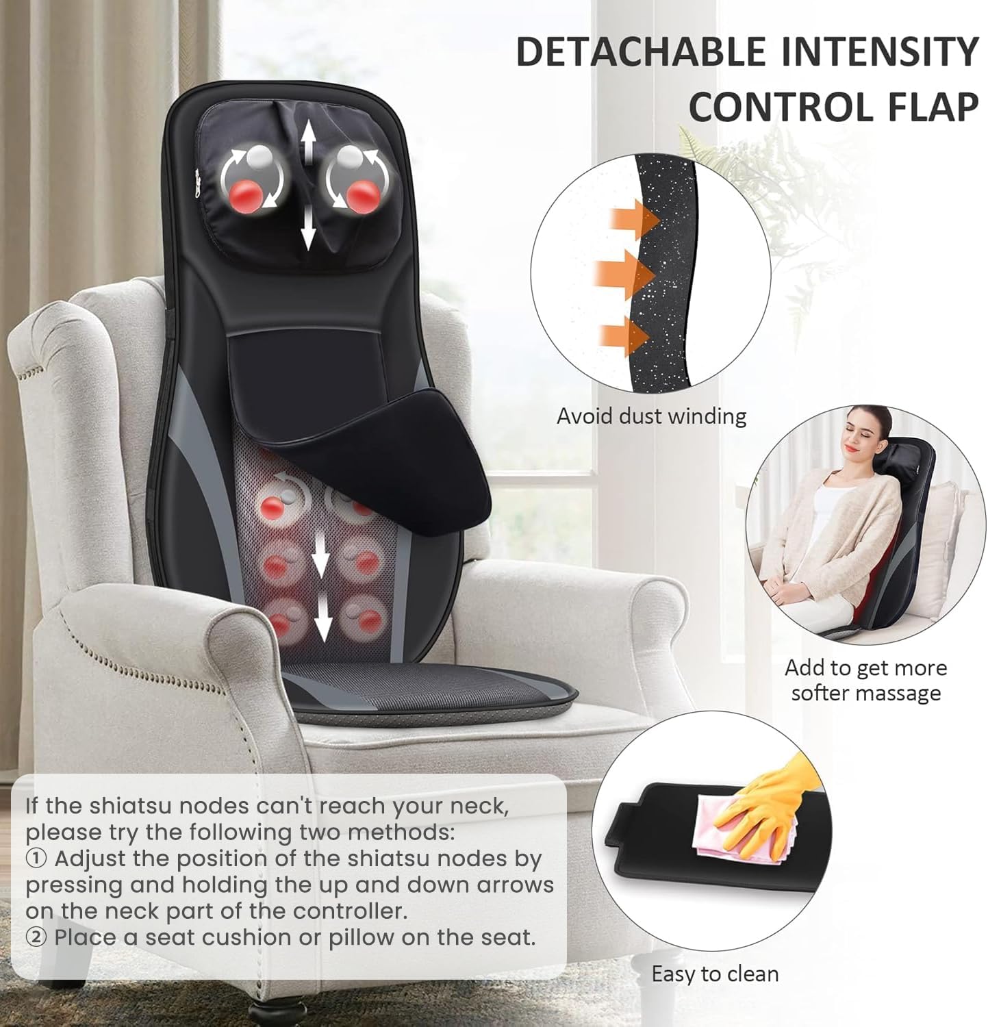 Shiatsu Back Massager with Heat, Snailax chair massager has 4 shiatsu rotation balls travel up & down relaxing full back. 3 Selective massage zones: Full/upper/lower back. Spot massage can focus on targeted area for pin-point relaxation. With heating pad for back, this heated back massager can further soothe muscle tension. The detachable FLAP allows you choose a softer or intense massage.