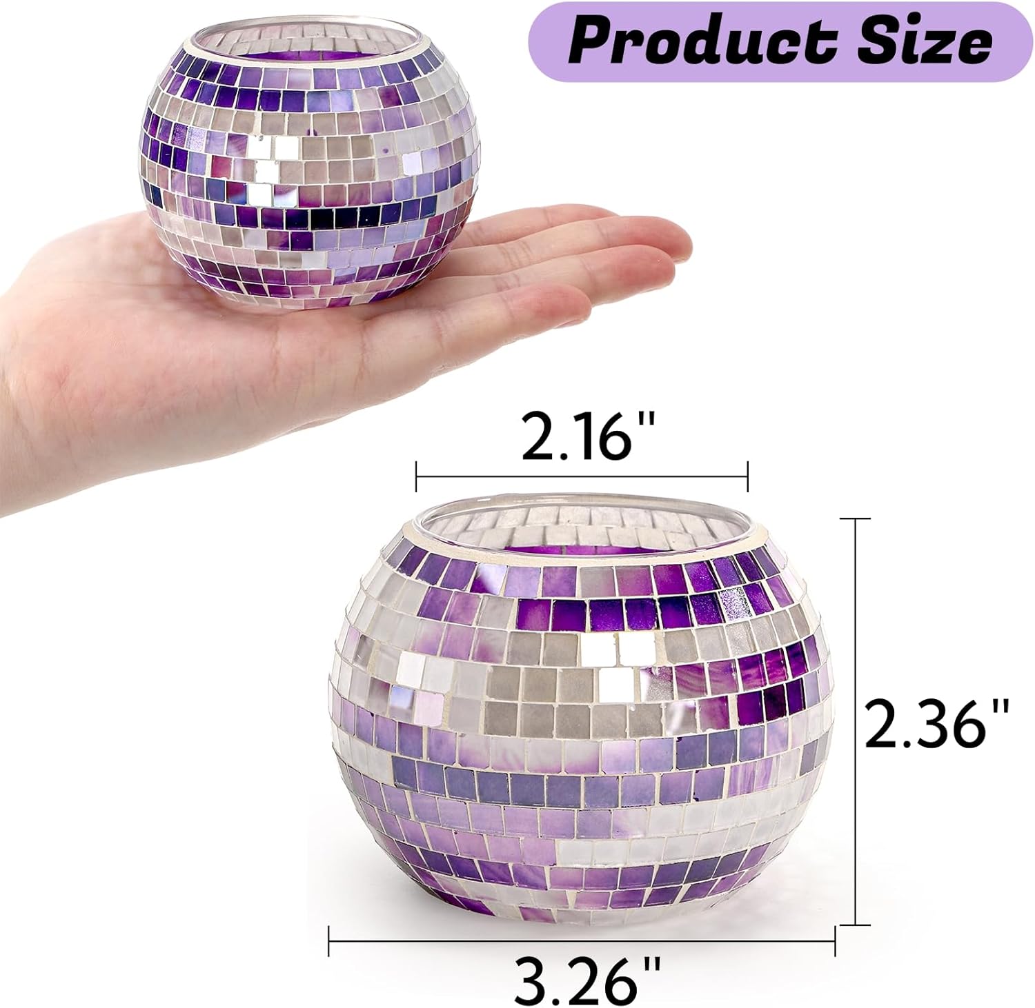 6 Pack Candle Holder: Package include 6 colors mosaic candle holders, size: Height 2.36”, diameter 3.26″, opening diameter 2.16”. Suitable for standard tea lights, votive candles, and LED lights within 2 inches diameter
