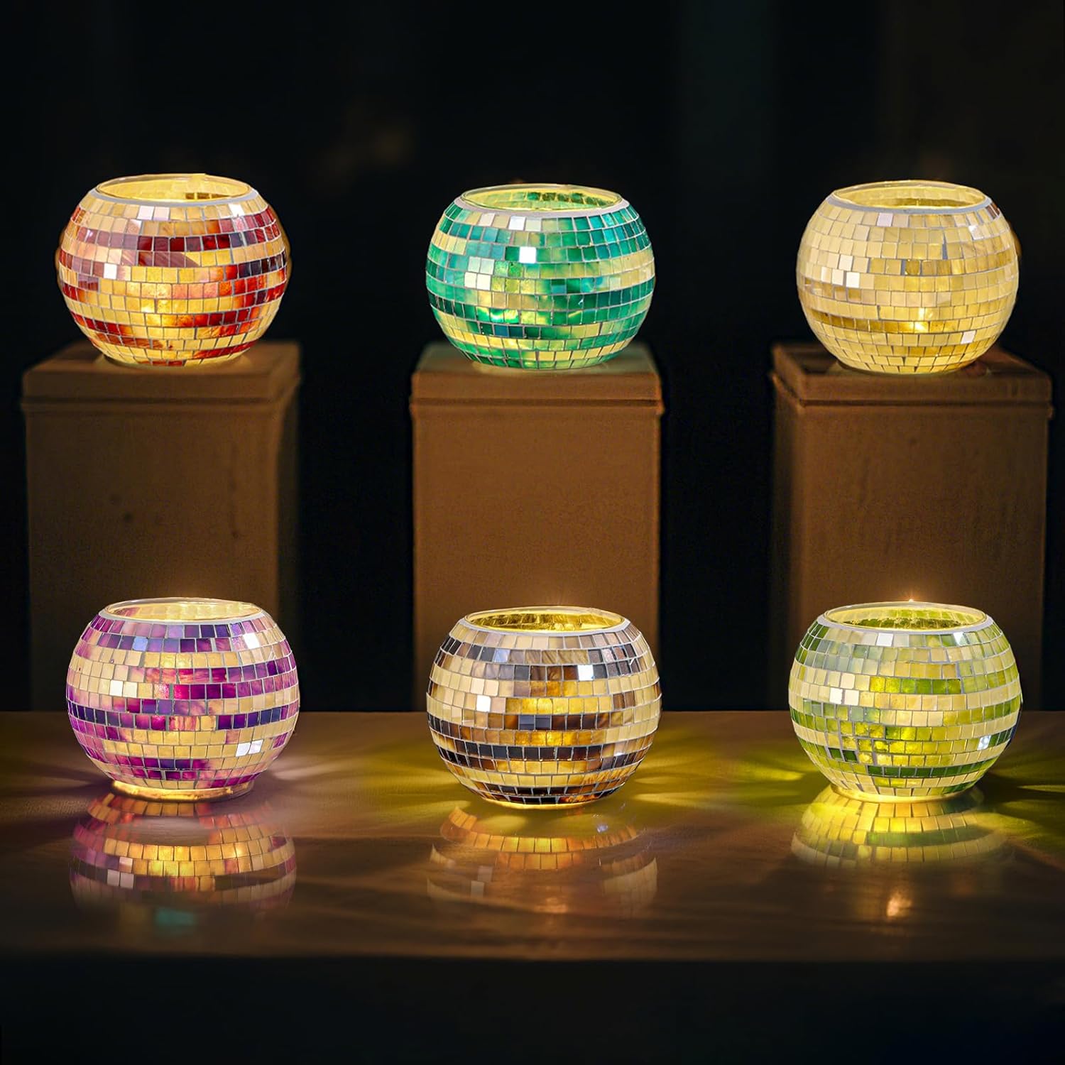 Package include 6 colors mosaic candle holders. Suitable for standard tea lights, votive candles, and LED lights within 2 inches diameter.
