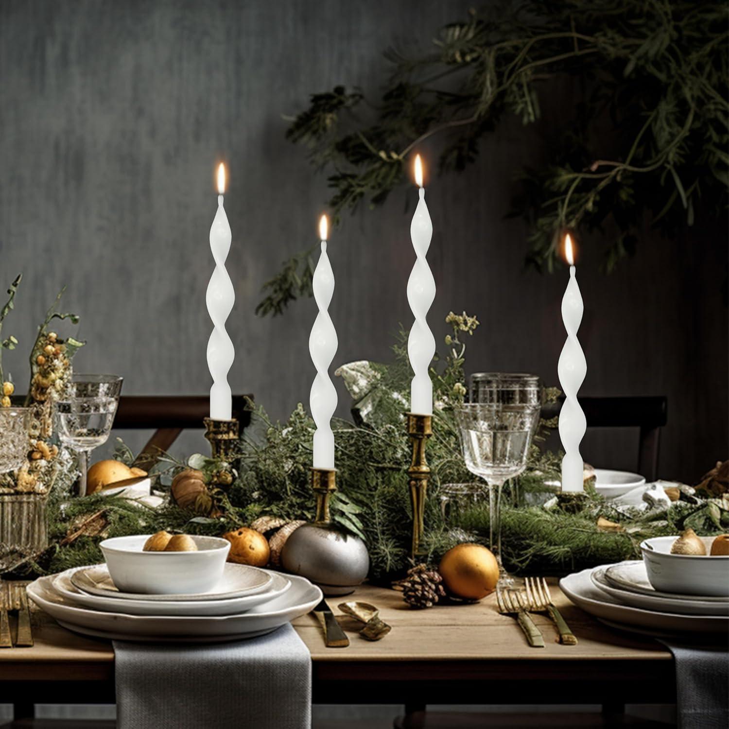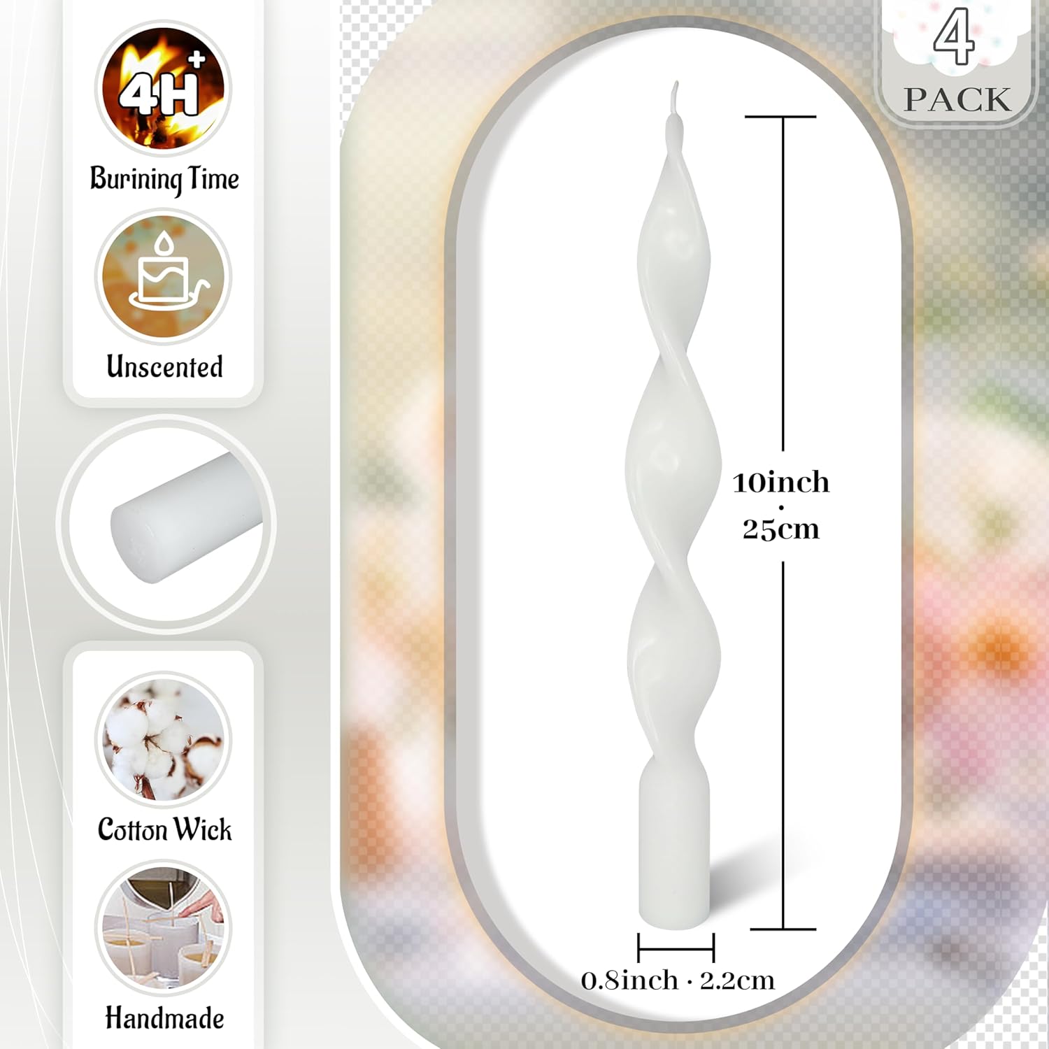 【Spiral Taper Candles】: This white taper candles is highly regarded for its unique spiral twisted appearance. Each funky candle sticks is carefully designed to display an elegant and charming spiral form, adding a touch of artistry to your space. Whether as a decoration or accent, this dinner candlesticks will bring a different kind of beauty to your life.