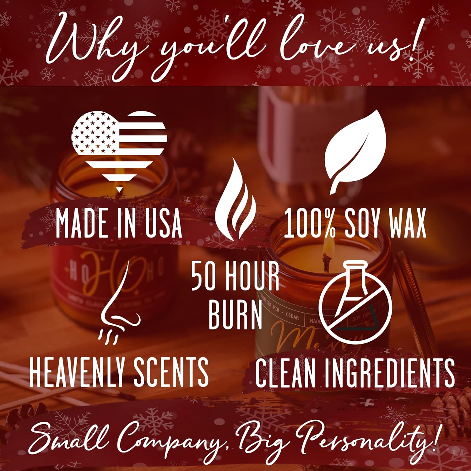 CHRISTMAS CANDLE WITH SOY WAX FOR AN ECO-FRIENDLY CLEAN BURN – each 9oz candle is hand poured in the USA using an all-natural blend of 100% Soy Wax ingredients, lead-free cotton wicks & premium fragrance oils, poured into a re-usable jar – so they’re good for your nose and body!
