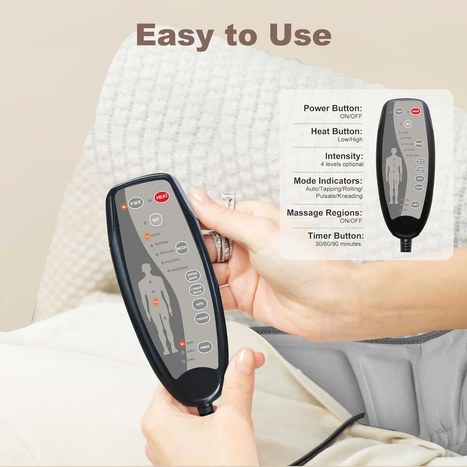 The chair massager allows you to tailor your massage experience with options to target specific areas such as the Neck, Upper back, Lower back, and Seat. Choose from 5 programmed modes and adjust between 4 massage intensities to create a massage that suits your needs perfectly.