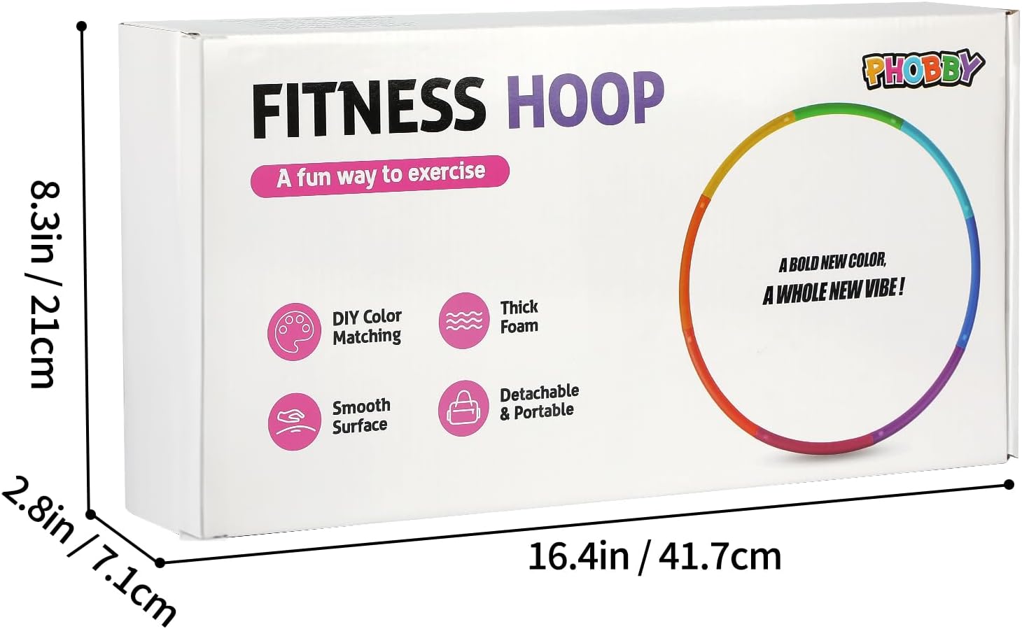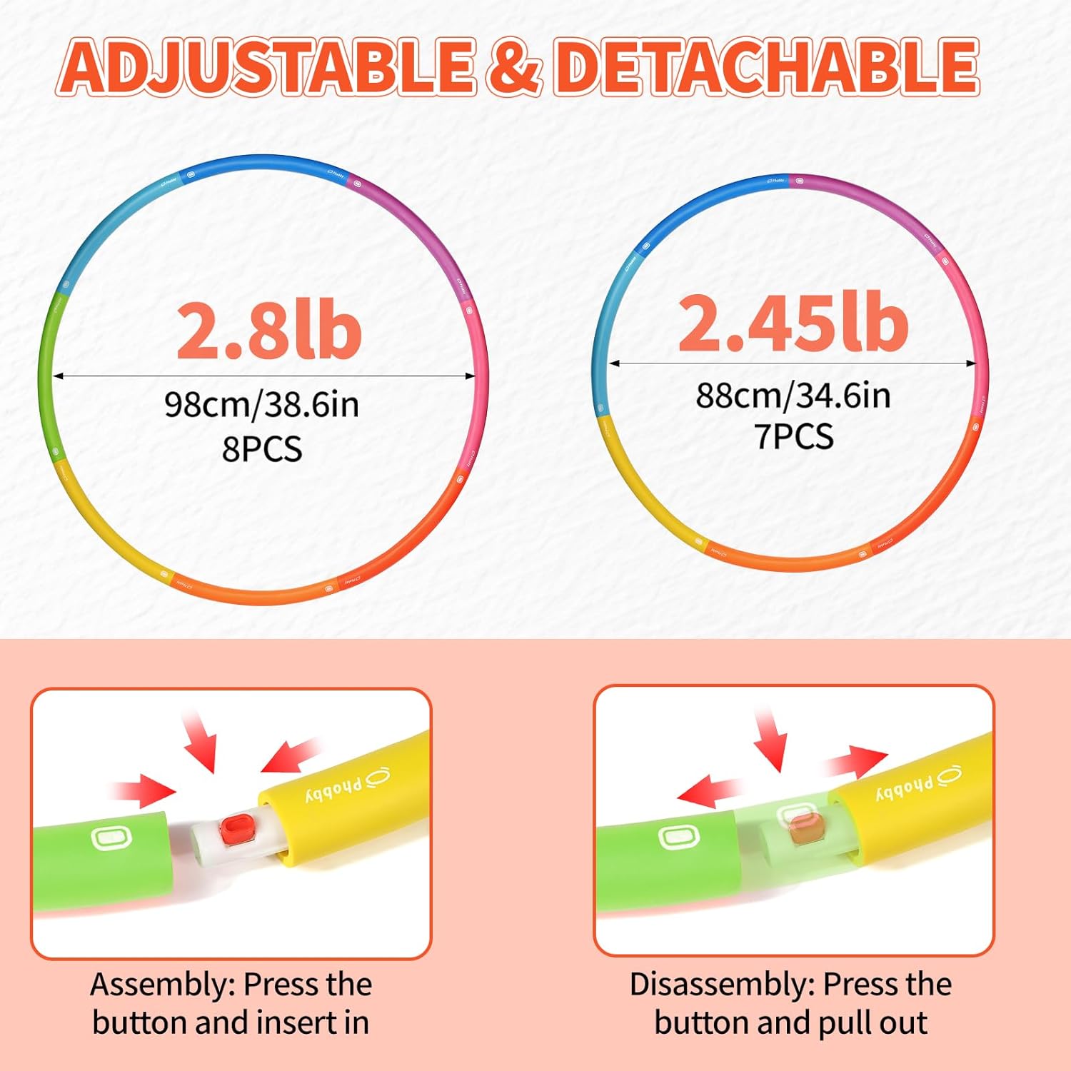 Tailored Fitness Experience: Phobby exercise hoop weighs approximately 2.8 lbs with a 39.4-inch in diameter. Features 8 colorful detachable sections—remove one section to adjust the size for your body type, making workouts more comfortable