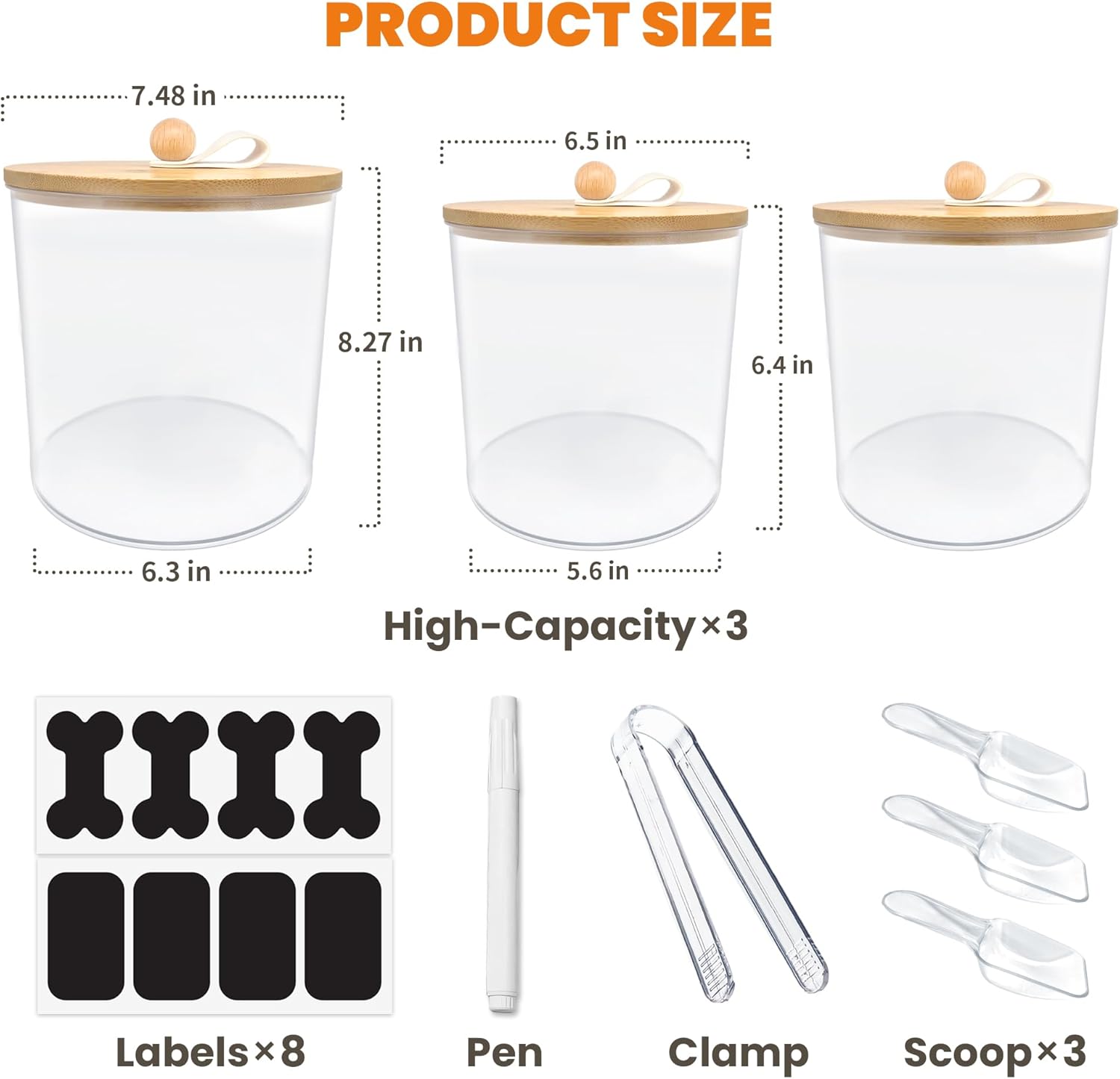 【3 Pack Dog Treat Jar】Keep your furry friend’s food fresh and your space neat and organized with these convenient dog food storage. This set includes 2 differently sized dog food bin-one large size (8.27″ x 7.48″) that can hold up to 7 lbs dog treat storage, and two medium sizes (6.5″ x 6.4″) that can each hold up to 5lbs pet food depending on the size and shape of the food.