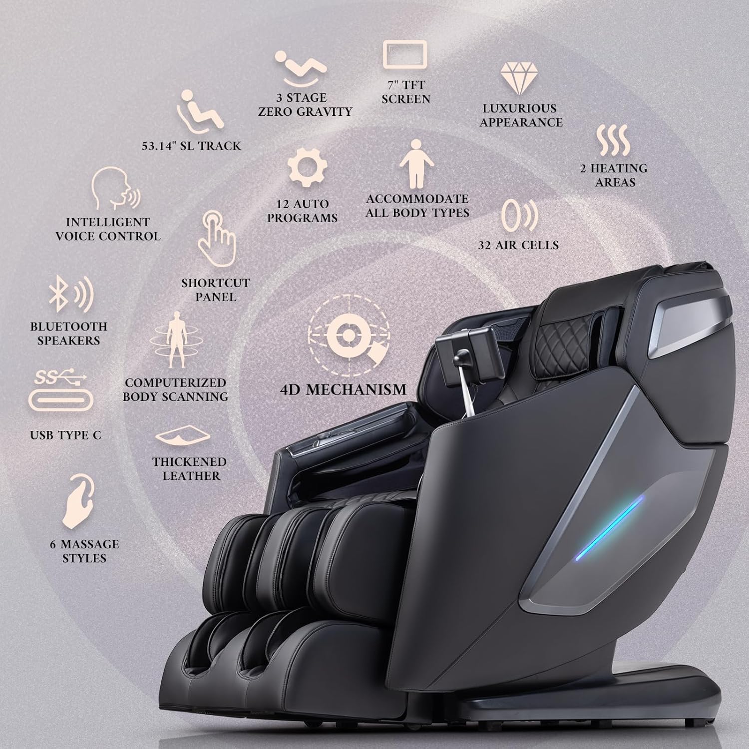 Intelligent Voice Control & Computerized Body Scanning: The chair features voice-activated controls, allowing you to adjust the settings effortlessly. With computerized body scanning technology, it customizes the massage based on your unique body shape and size for maximum comfort and effectiveness.