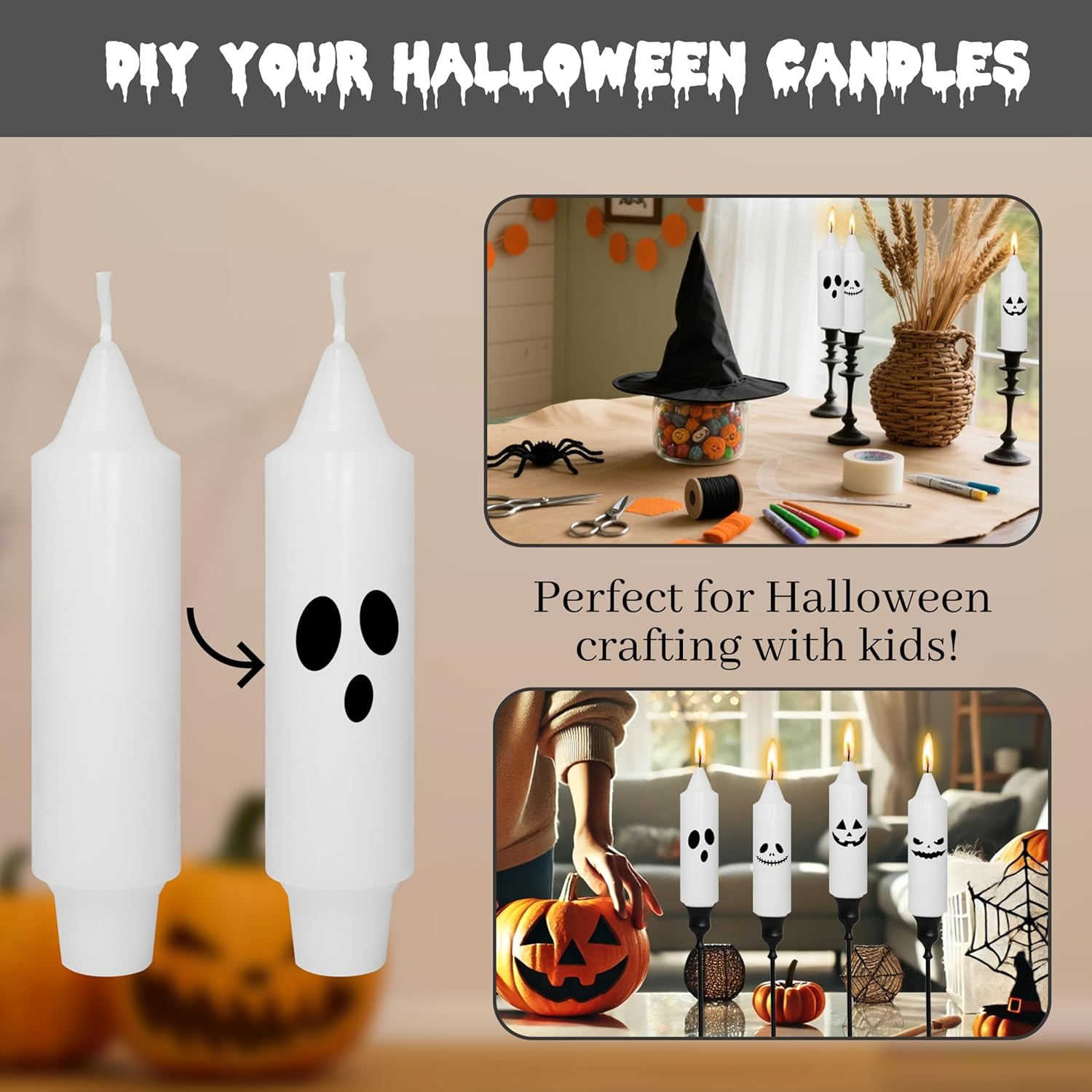 【Fun DIY Halloween Taper Candles 】 Unleash your creativity with our 4-pack of short white taper candles! These blank canvases are perfect for DIY Halloween candlesticks—decorate them to look like ghosts, skeletons, or other festive figures. It’s a fun family activity that sparks imagination and delivers a personalized touch to your Halloween setup. These small taper candles offer a unique and engaging experience for all ages.