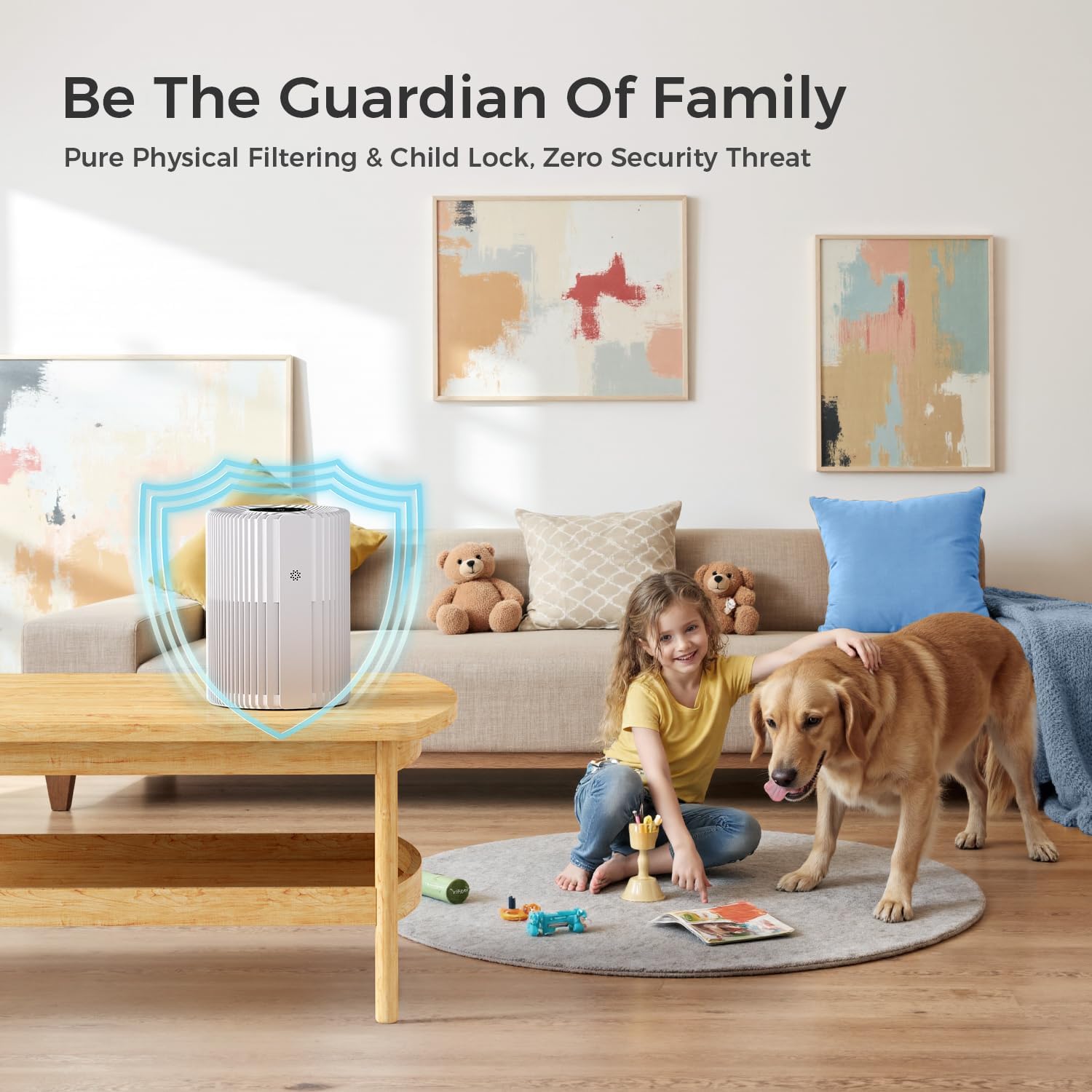 Ensuring Family Safety: We use a pure physical filtration system, with no threat of ozone inhalation. Our purifiers feature a one-touch child lock to effectively prevent any problems caused by accidental contact, acting as a guardian of air quality.