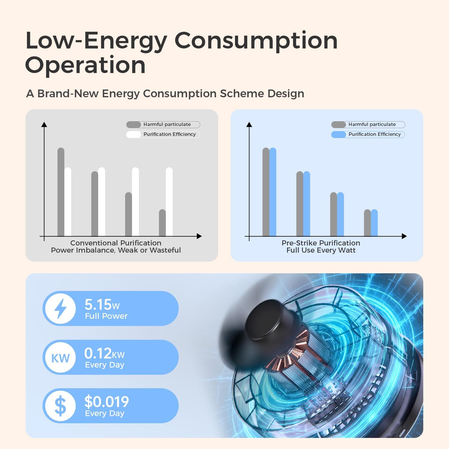 Low Energy Consumption: We always care about your electricity bills. Our purifiers under ATUO mode consume less electricity while providing the same purification effect. Even at full power with a 4-speed fan, the daily electricity cost is only US$0.019, which is lower than other purifiers.