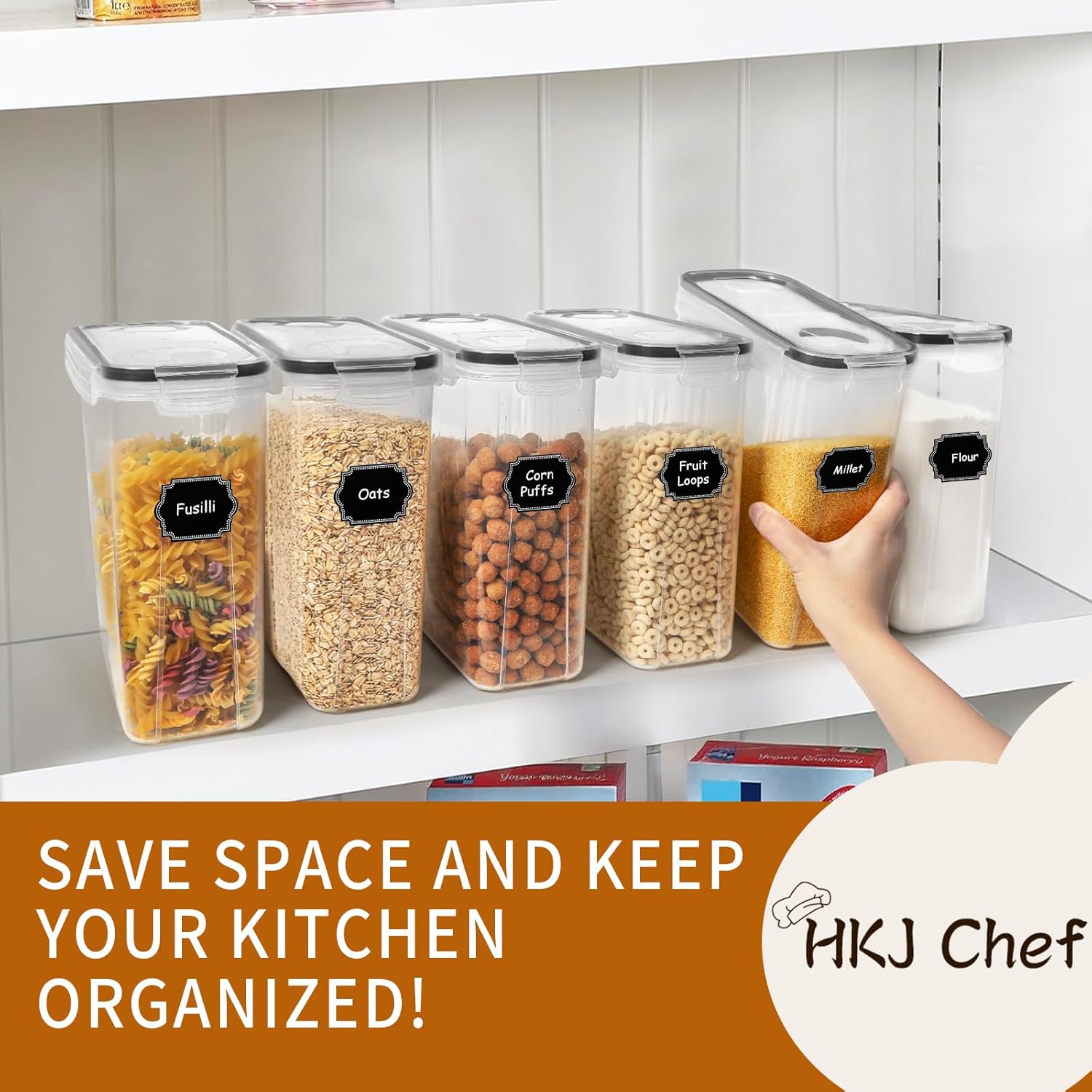 Cereal Containers Set : HKJ Chef cereal containers storage set includes 6PCS large cereal storage containers (4L / 135.2fl.oz), 20 reusable labels, 2 pour spouts,1 measuring cup and 1 marker. The kitchen storage organization containers can be dishwasher safe, but the lids are not