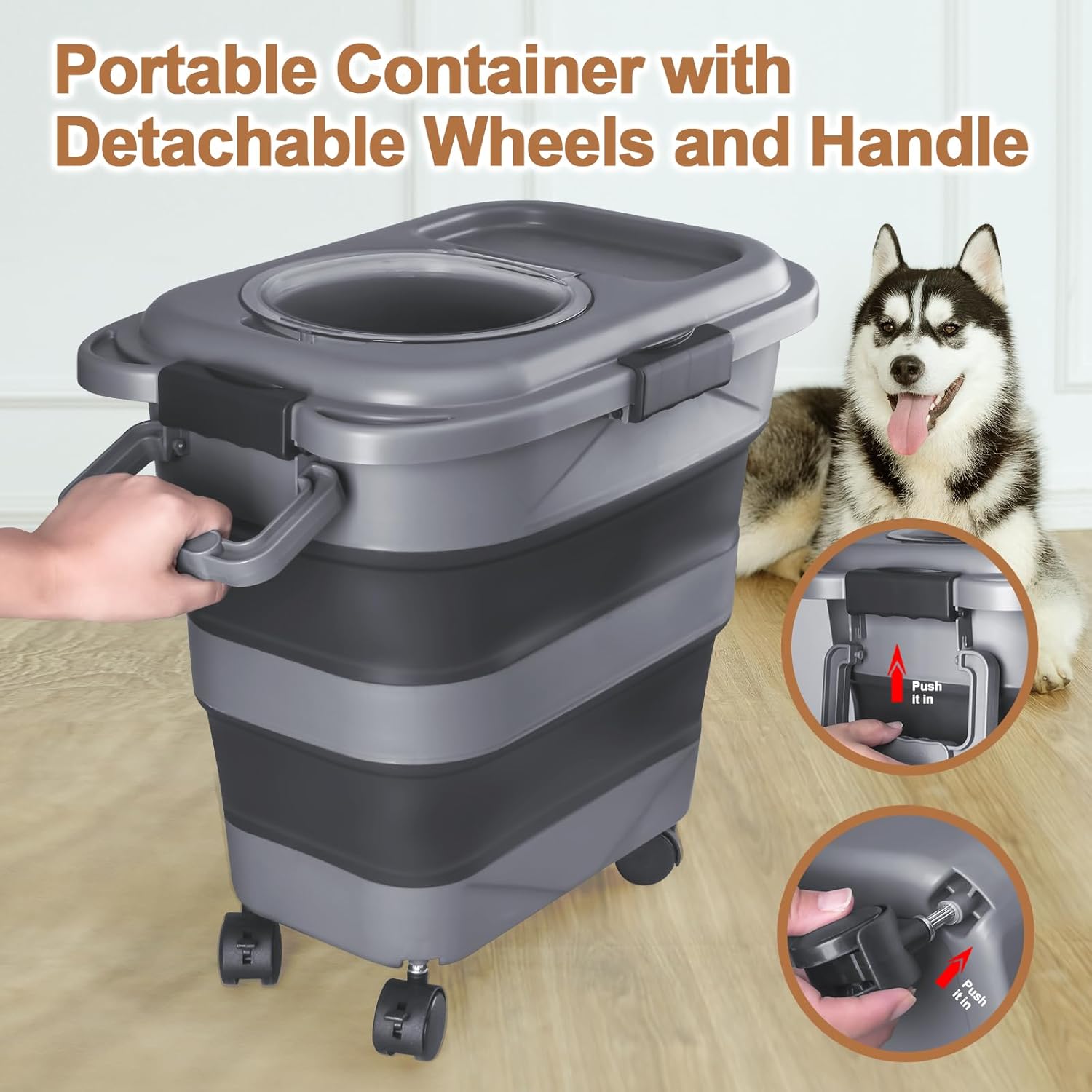 Upgraded Collapsible Dog Food Storage: This Upgraded Cat Food Container is with large handle. It’s easy to move around or you can hang it up to save space. The pet food container is perfect to storage dog, cat, birds food and human dry food of rice, flour and beans