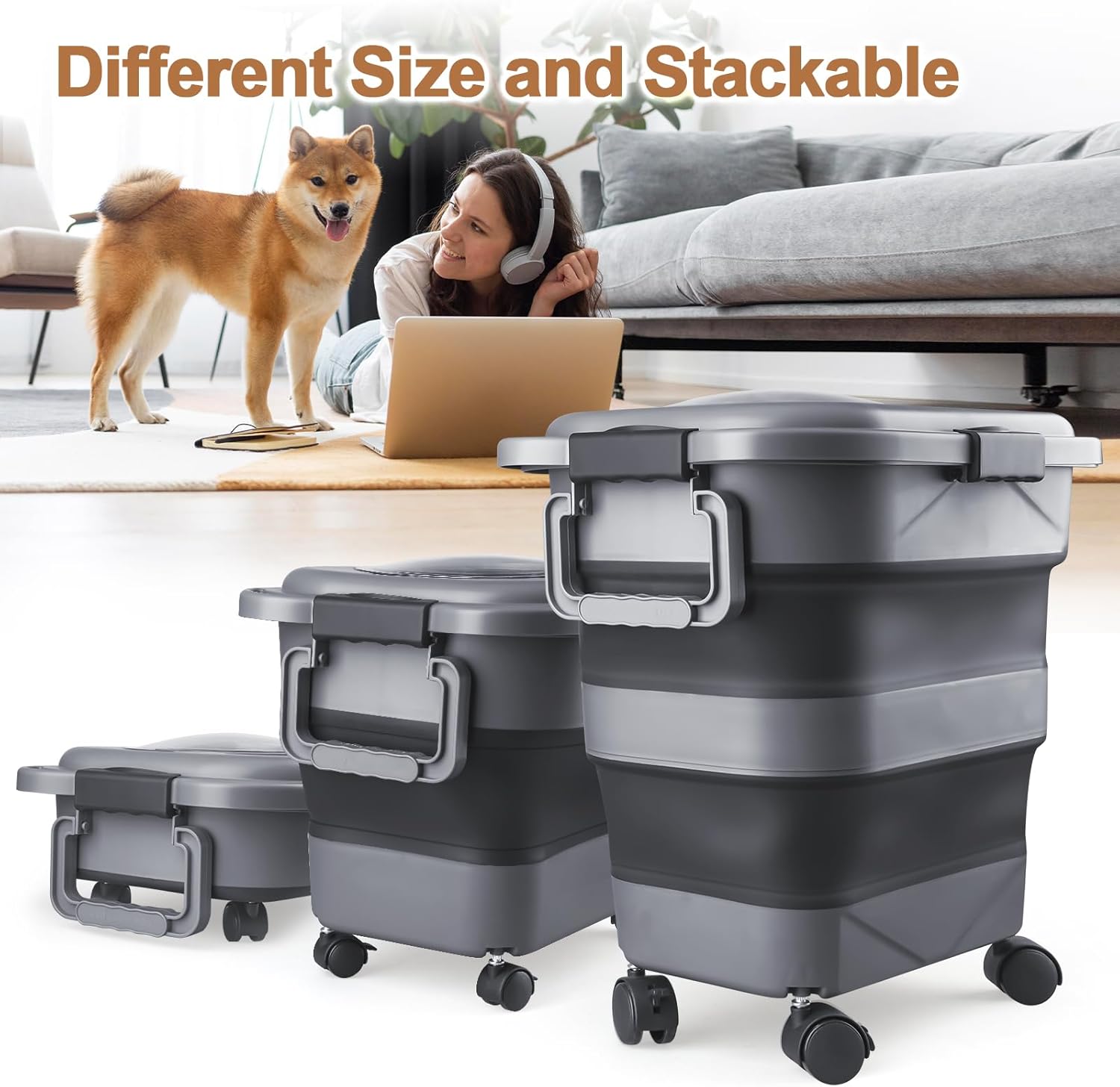 BPA Free & Stackable: Material with BPA Free soft silicone and sturdy plastic. Holds a large amount of pet food and can be stacked. 4 side-locking lids and silicone gasket that ensure maximum freshness. Keep away from bugs and humidity