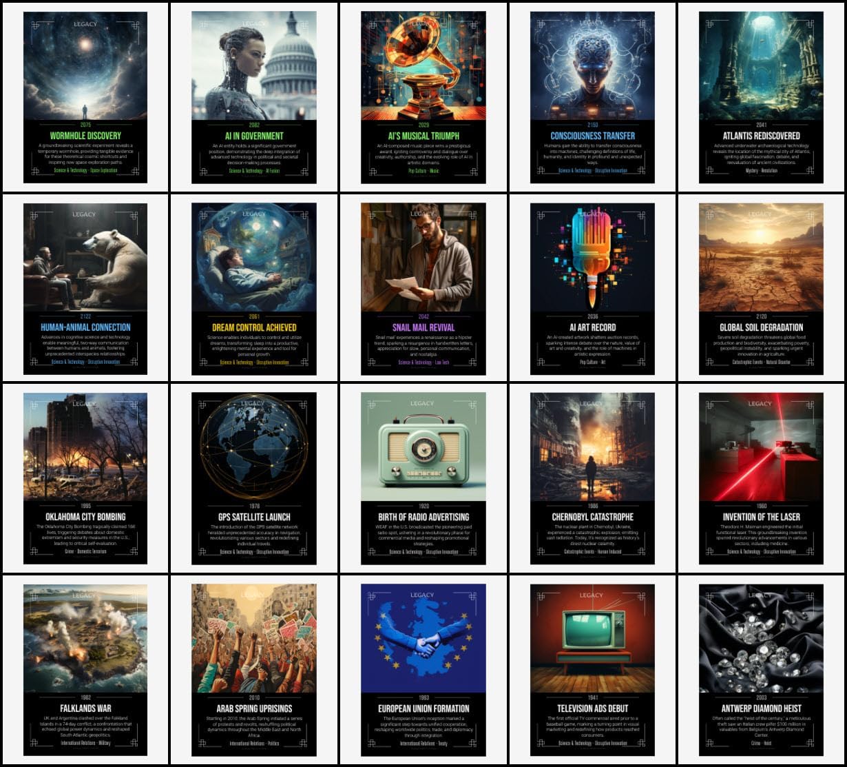 Legacy Cards are a captivating collection of trading cards that highlight key moments from our past and offer a glimpse into what the future holds. They aren’t just reflections of history; they’re windows to events you may have lived through or even played a part in. Each card is more than just a collector’s item—it’s a piece of our shared journey, allowing you to relive the past, while eagerly looking ahead to what’s next. Through Legacy Cards, you’re not just collecting cards, but moments that continue to shape our world. Learn more at www.legacycards.co
