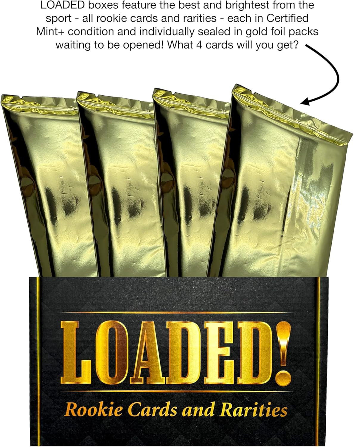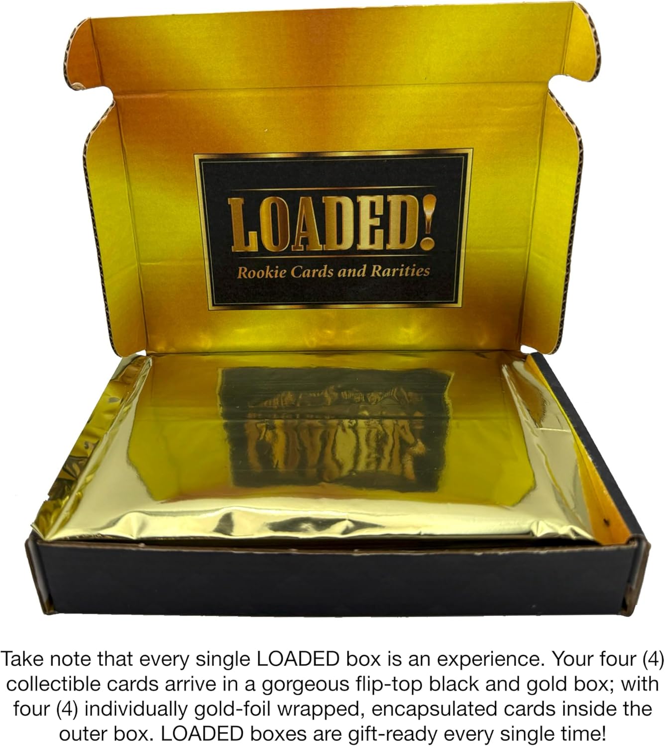 Take note that every single LOADED! box is an experience; your four (4) collectible cards arrive in a gorgeous flip-top black and gold box; with four (4) individually gold-foil wrapped, encapsulated cards inside the outer box; LOADED! boxes are gift-ready every single time