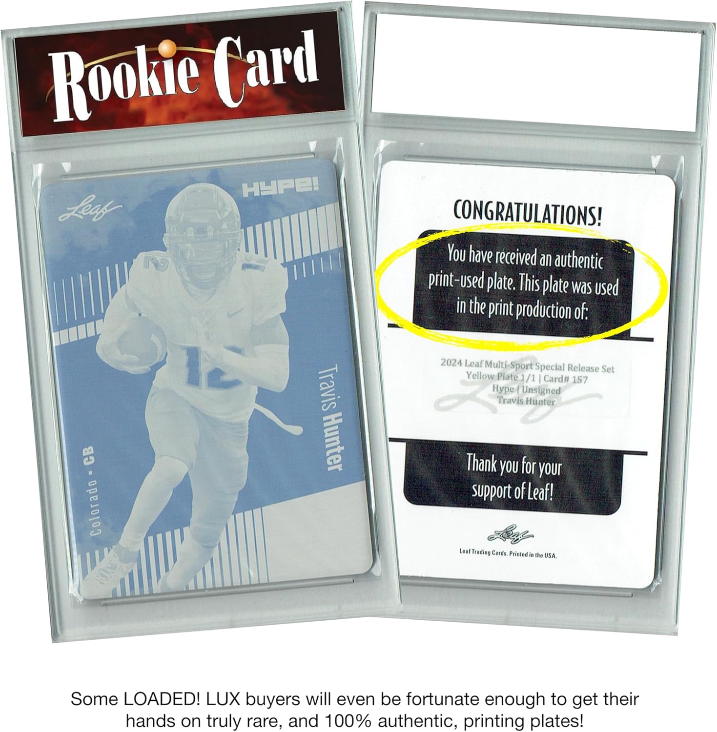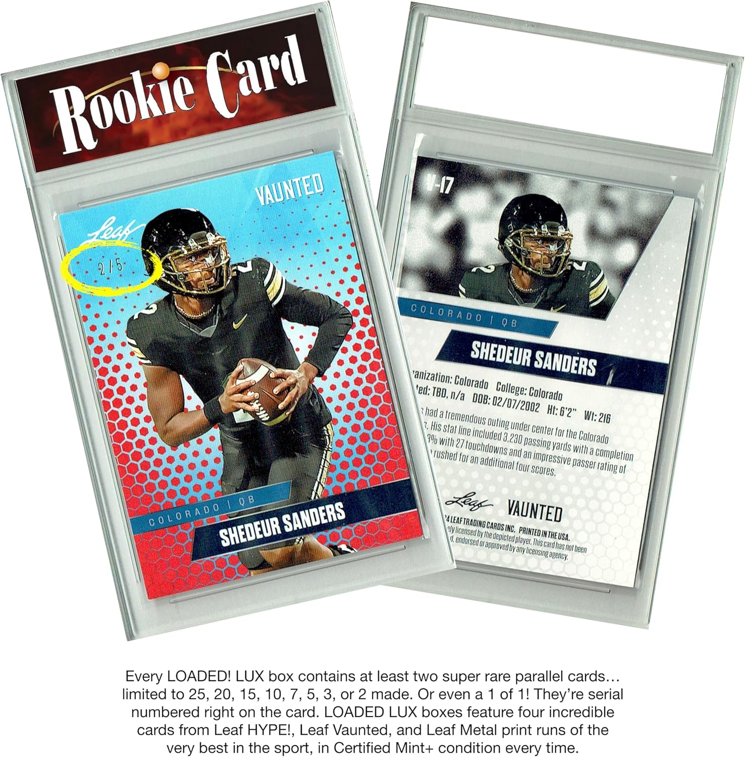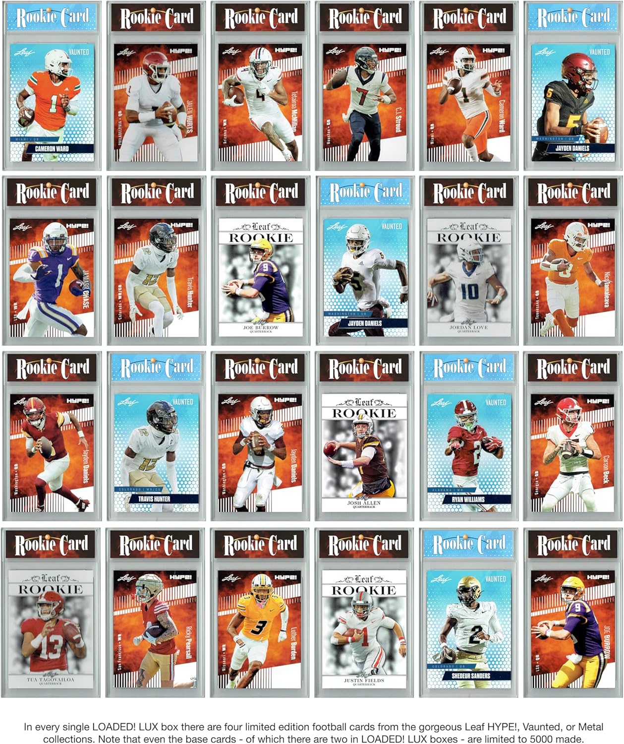 The fun is back in the pack with LOADED! LUX Edition Football trading card boxes. These boxes are brimming with value. LOADED! LUX is trading card luxury, delivering superior trading cards that are incredibly limited, serial numbered special editions. Your box will include four great cards from Leaf HYPE!, Leaf Vaunted, and Leaf Metal print runs in Certified Mint+ condition. They’ll be individually sealed in foil packs waiting to be opened. What 4 cards will you get? In every LOADED! LUX box you will get four limited edition football cards from the gorgeous Leaf HYPE!, Vaunted or Metal collections. Even the base cards are limited to 5000 made. Every single box contains at least two super rare parallel cards – limited to 25, 20, 15, 10, 7, 5, 3 or 2 made, or even a true 1 of 1. Serial numbered right on the card. Some boxes will include authentic and truly rare printing plates! This box is all studs, no duds. Every card is a rookie or a short print, or both, of superstars, top draft picks, GOATs, and living legends. We’ve got the likes of Joe Burrow, Travis Hunter, Josh Allen, Ja’Marr Chase, Cam Ward, Jayden Daniels, Puka Nakua, Justin Jefferson, Bo Nix, J.J. McCarthy, Caleb Williams, Drake Maye, Shedeur Sanders and more. Also next gen studs like Ryan Williams & Nico Iamaleava. No filler or fluff. Every card is licensed by the player. The LOADED! LUX box is a premium unboxing experience. Your four (4) collectible, encapsulated cards will arrive safely, gold-foil wrapped, in a gorgeous flip-top box. LOADED! LUX boxes are gift-ready every single time. Remember that in every LUX box at least two cards will be numbered to 25 or less, ensuring amazing value. Each slabbed card is in Certified Mint+ condition or better, sealed in an air-tight customized holder using a sonic welding system. Every card is thoroughly reviewed. Only the best are encapsulated in tamper resistant holders. They’re ready for high end grading if that’s your thing.