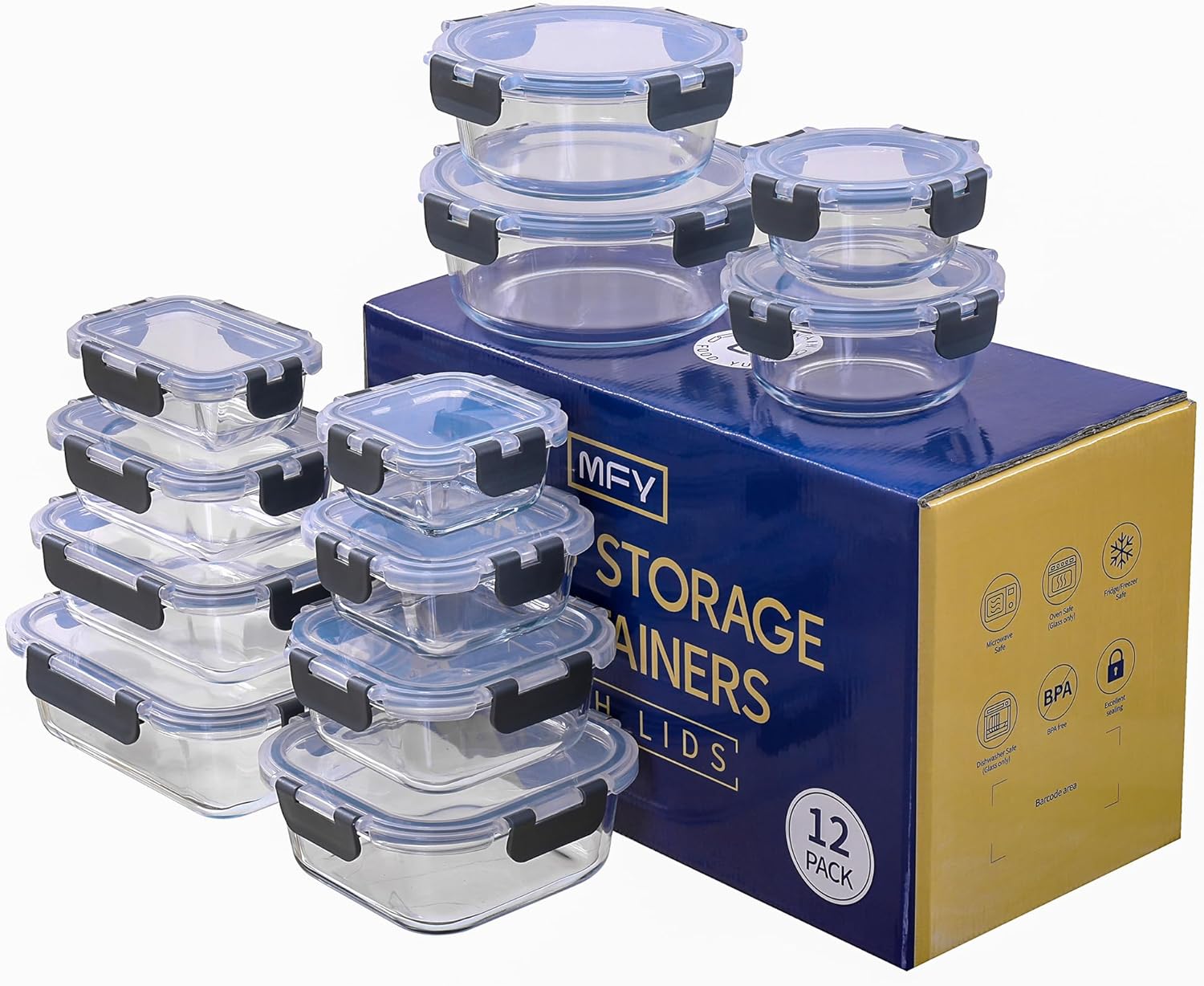 MFY 12-Pack Glass Storage Containers with Lids, Glass Meal Prep Containers Set, Airtight Lunch Containers with Lids, Microwave, Oven, Freezer and Dishwasher Safe, Gray