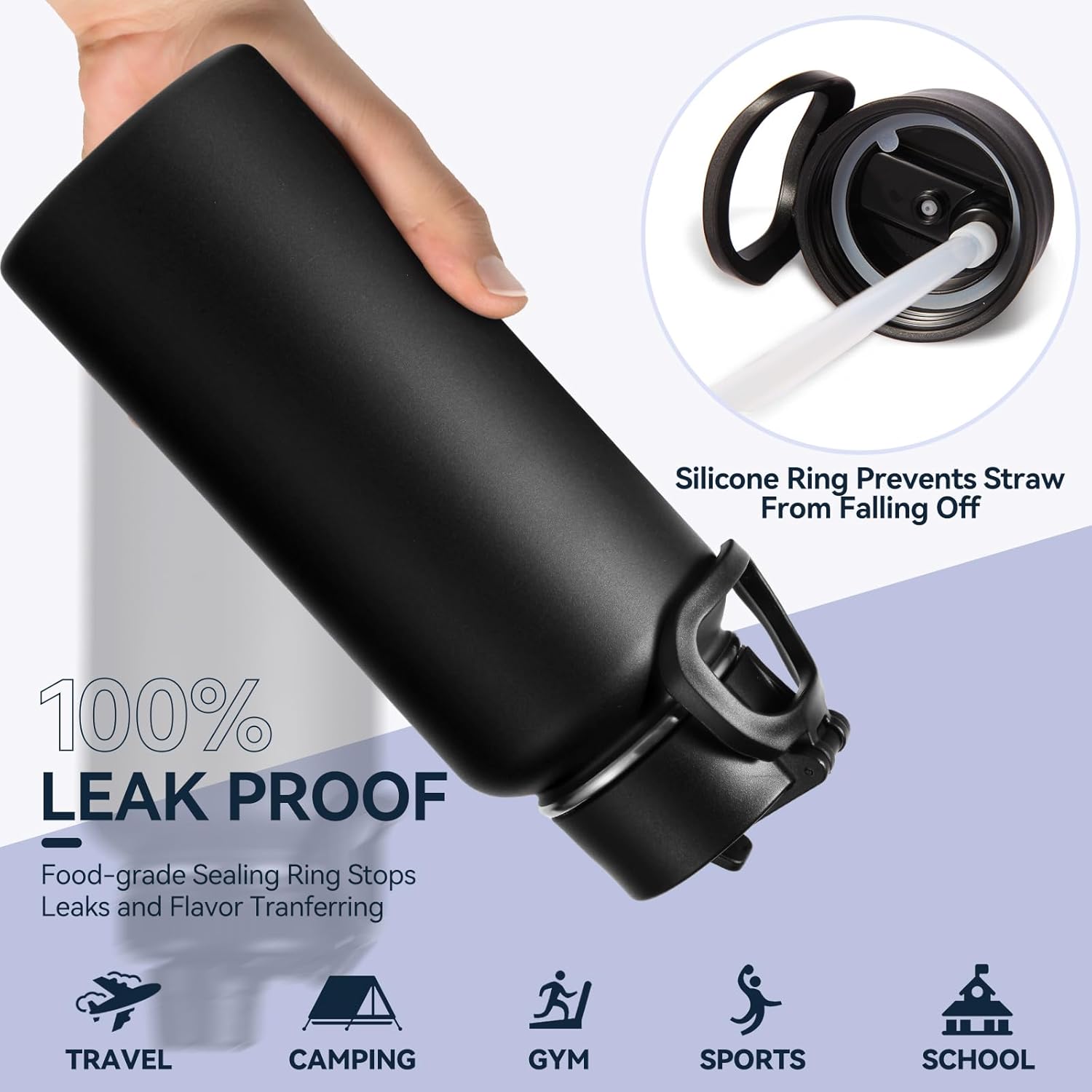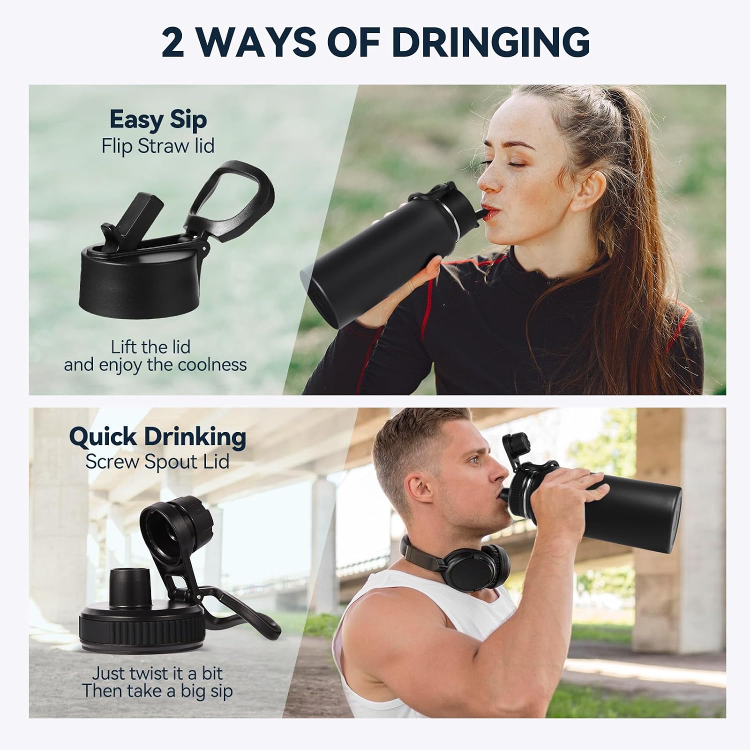 Neihepal 32 oz Insulated Water Bottle with 2 Lids (Straw & Spout Lid), 18/8 Stainless Steel Double Wall Water Bottles for Gym, Travel, Camping, Sports (Black,1 Pack)