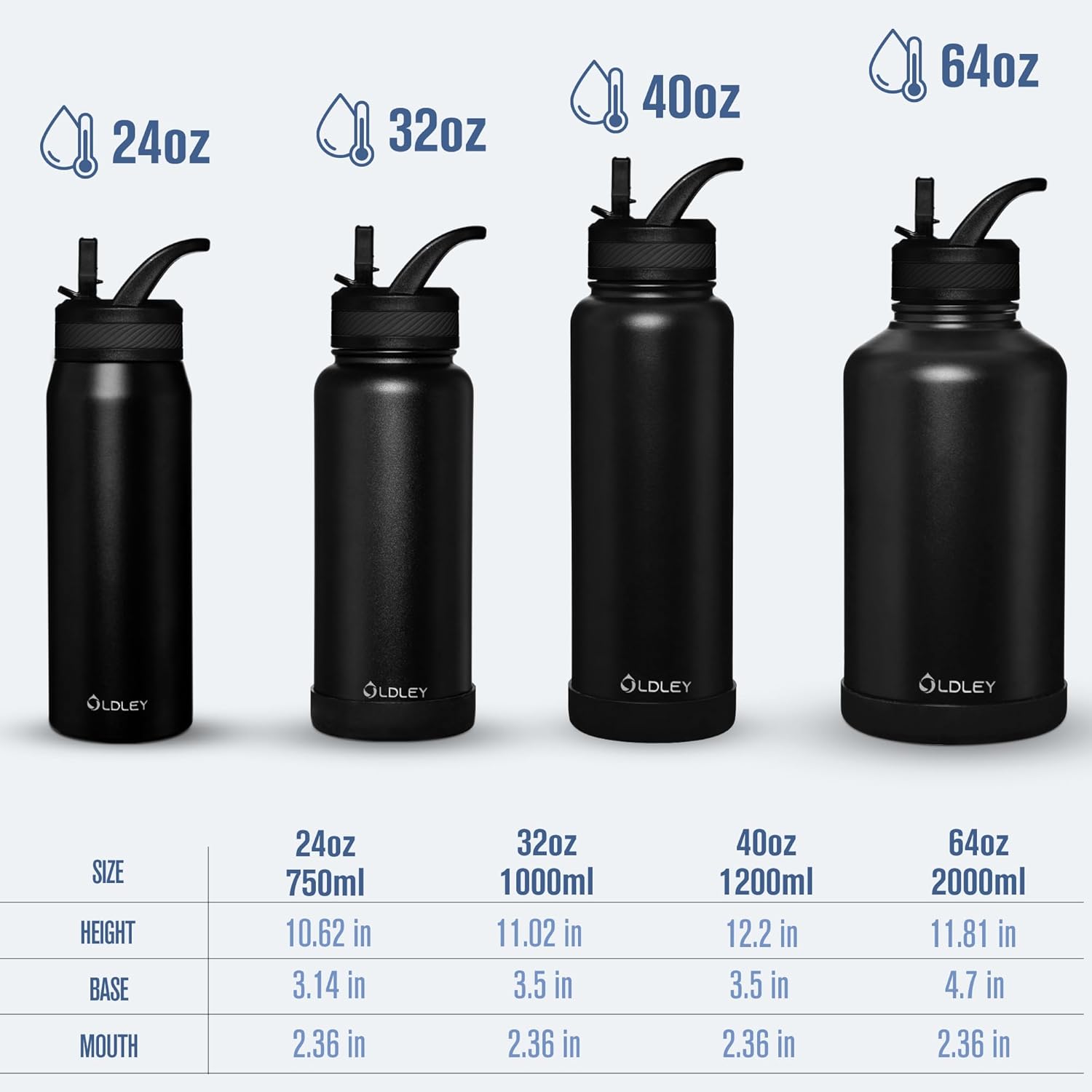 OLDLEY 40 oz Insulated Water Bottle With Straw, Stainless Steel Sports Water Cup Flask with 3 Lids(Straw, Spout and Handle Lid) Double Walled Travel Thermal Canteen Mug,Black