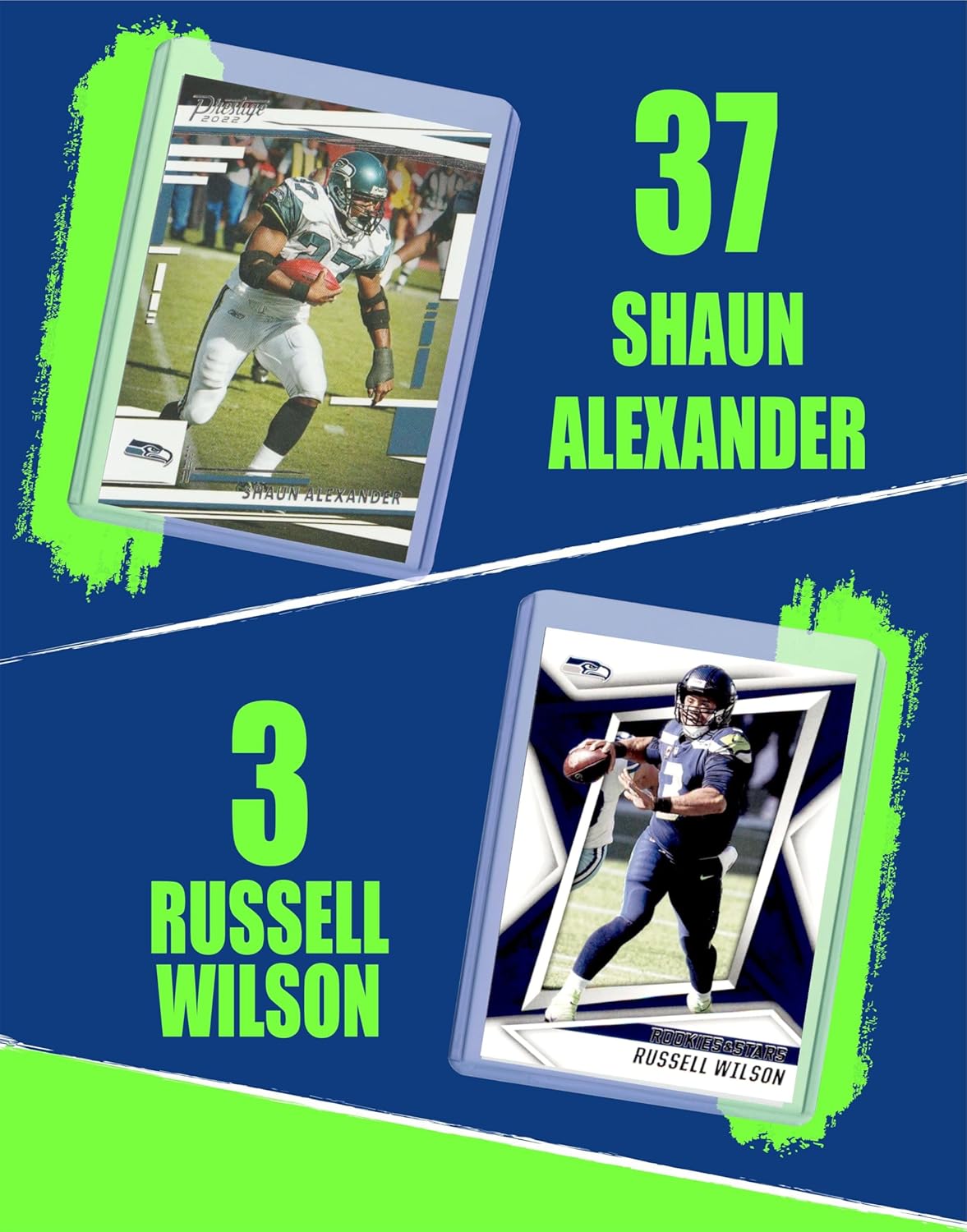 The Seahawks are red hot! This lot of eight 2006-2025 Seattle Seahawks football cards makes a great gift and collectors item for any Seahawks fan. Guaranteed to include one card each of Sam Darnold, Kenneth Walker III, Jaxon Smith-Njigba, Tyler Lockett, Cooper Kupp, Marquez Valdes-Scantling, Shaun Alexander, and Russell Wilson. Exact card of each player varies and may include cards in past team uniforms. All cards are in near mint to mint condition and are shipped with each card in its own individual soft sleeve and top loader or semi-rigid sleeve. Comes with bonus gift bag and two wristbands in team colors, making it the perfect gift for the youth fan. WRISTBANDS AND GIFT BAG INCLUDED ARE UNBRANDED GIFT ITEMS AND DO NOT CONTAIN ANY TEAM OR LEAGUE RELATED BRANDING, LOGOS, OR TEXT.