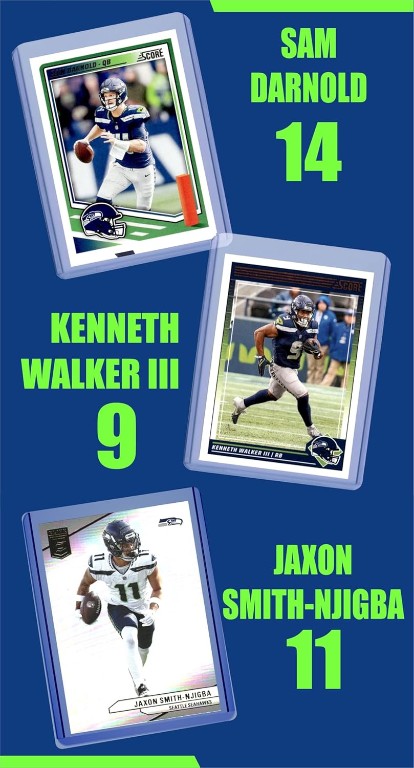 GUARANTEED – to include one card each of Sam Darnold, Kenneth Walker III, Jaxon Smith-Njigba, Tyler Lockett, Cooper Kupp, Marquez Valdes-Scantling, Shaun Alexander, and Russell Wilson. Exact card of each player varies and may include cards in a past team jersey.