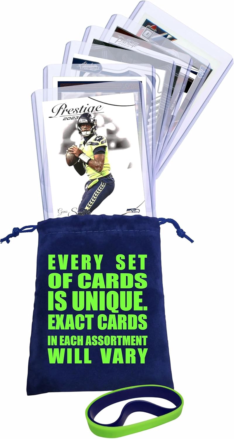 The Seahawks are red hot! This lot of eight 2006-2025 Seattle Seahawks football cards makes a great gift and collectors item for any Seahawks fan. Guaranteed to include one card each of Sam Darnold, Kenneth Walker III, Jaxon Smith-Njigba, Tyler Lockett, Cooper Kupp, Marquez Valdes-Scantling, Shaun Alexander, and Russell Wilson. Exact card of each player varies and may include cards in past team uniforms. All cards are in near mint to mint condition and are shipped with each card in its own individual soft sleeve and top loader or semi-rigid sleeve. Comes with bonus gift bag and two wristbands in team colors, making it the perfect gift for the youth fan. WRISTBANDS AND GIFT BAG INCLUDED ARE UNBRANDED GIFT ITEMS AND DO NOT CONTAIN ANY TEAM OR LEAGUE RELATED BRANDING, LOGOS, OR TEXT.