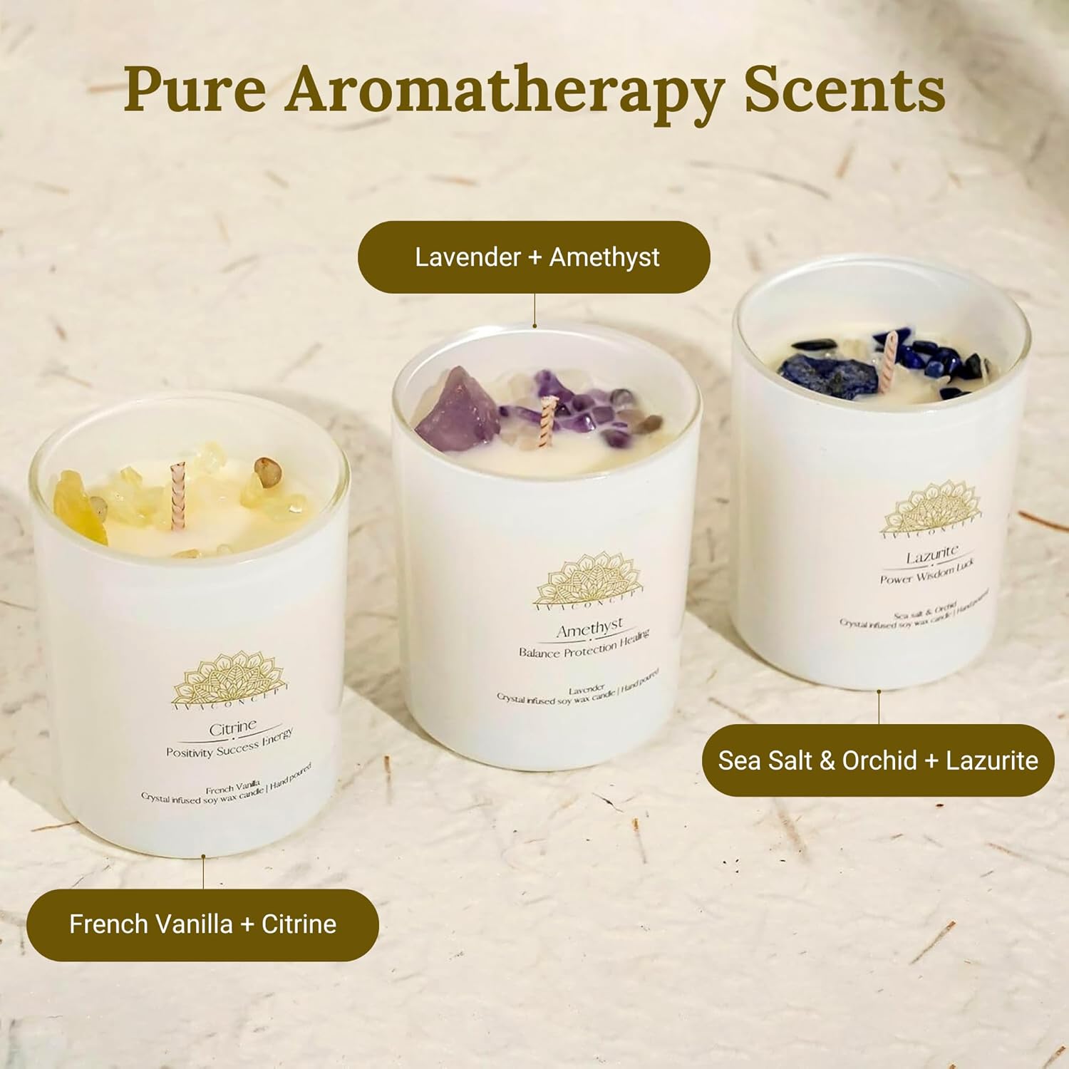 Three Luxurious Fragrances:This candle set includes Lavender with Amethyst for relaxation, Sea Salt & Orchid with Lazurite for freshness, and French Vanilla with Citrine for warmth. Each aromatherapy candle offers unique sensory experiences for you.
