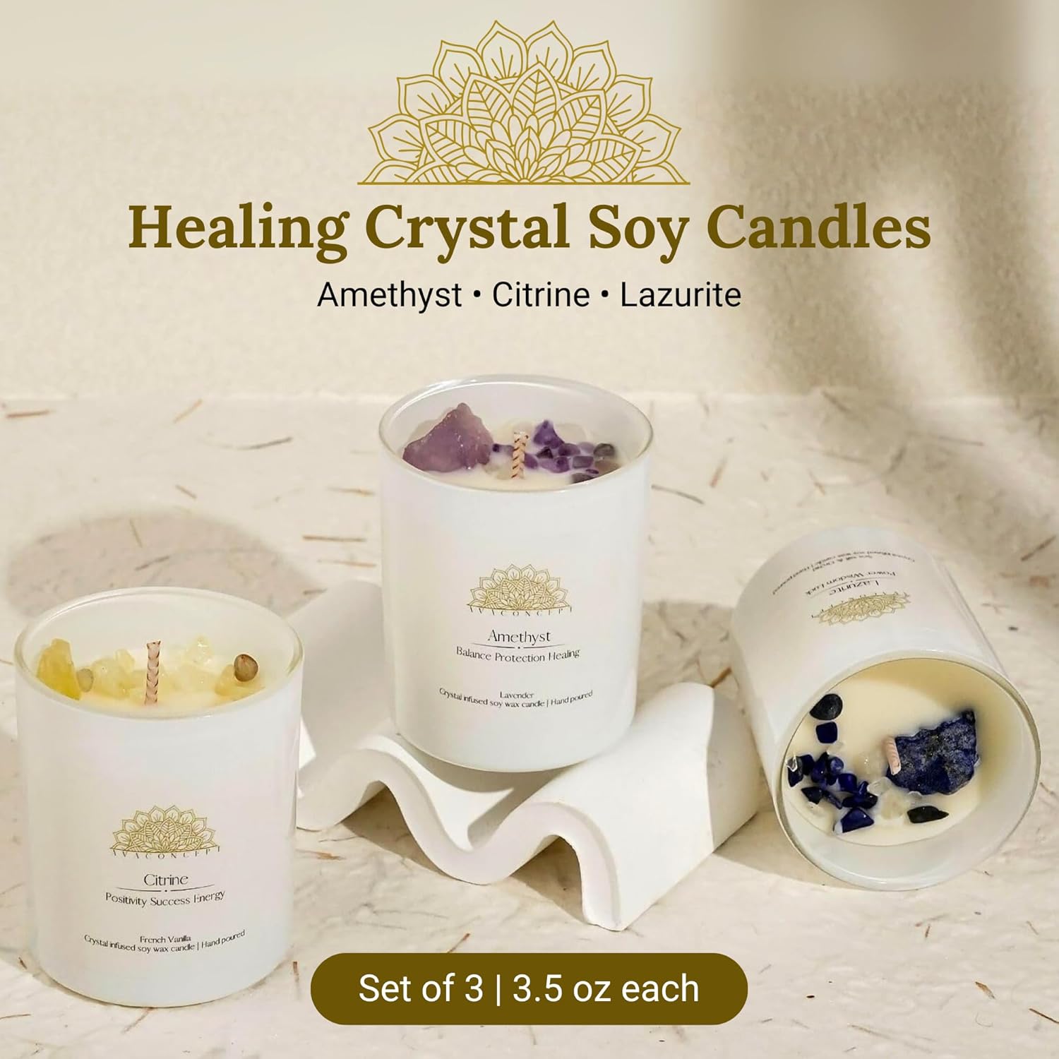 Premium Quality: Crafted from 100% natural soy wax with cotton wicks, these scented candles burn clean and smoke-free. Each small candle features authentic crystals including Amethyst, Citrine, and Lazurite embedded inside for visual appeal.
