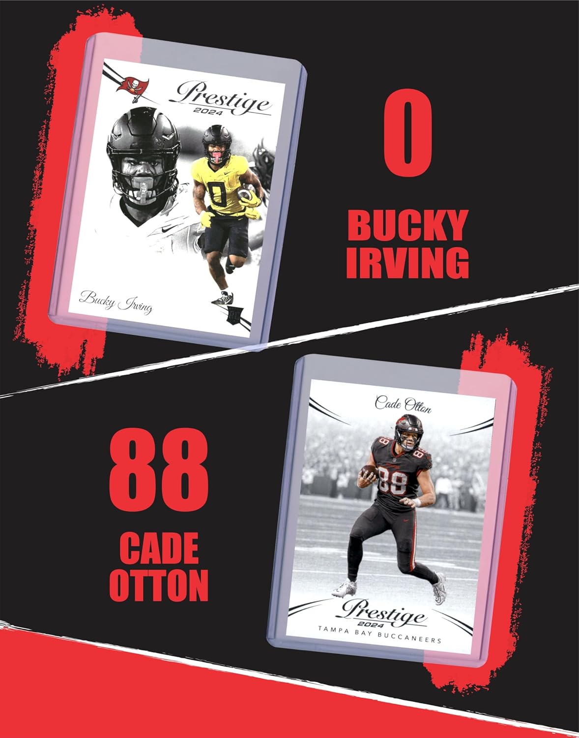 GUARANTEED – to include one card each of Baker Mayfield, Mike Evans, Chris Godwin, Rachaad White, Lavonte David, Bucky Irving, and Cade Otton. Exact card of each player varies and may include cards in a past team jersey.