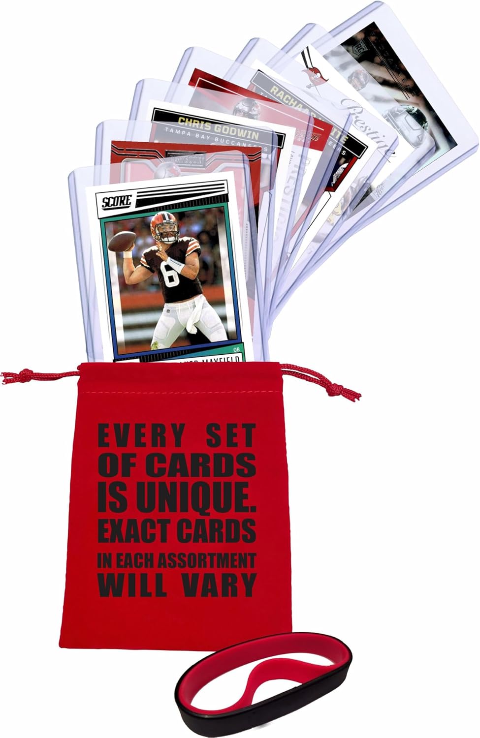 The Buccaneers are red hot! This lot of seven 2006-2025 Tampa Bay Buccaneers football cards makes a great gift and collect Baker Mayfield, Mike Evans, Chris Godwin, Rachaad White, Lavonte David, Bucky Irving, and Cade Otton. Exact card of each player varies and will likely include cards in past team uniforms. All cards are in near mint to mint condition and are shipped with each card in its own individual soft sleeve and top loader or semi-rigid sleeve. Comes with bonus gift bag and two wristbands in team colors, making it the perfect gift for the youth fan. WRISTBANDS AND GIFT BAG INCLUDED ARE UNBRANDED GIFT ITEMS AND DO NOT CONTAIN ANY TEAM OR LEAGUE RELATED BRANDING, LOGOS, OR TEXT.