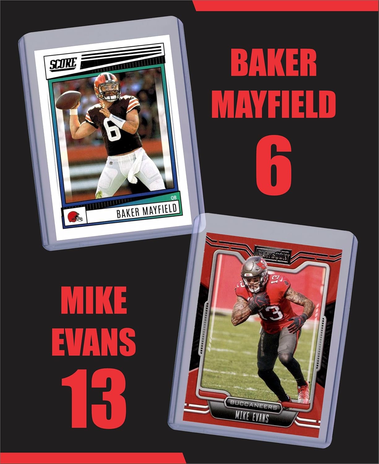 GUARANTEED – to include one card each of Baker Mayfield, Mike Evans, Chris Godwin, Rachaad White, Lavonte David, Bucky Irving, and Cade Otton. Exact card of each player varies and may include cards in a past team jersey.